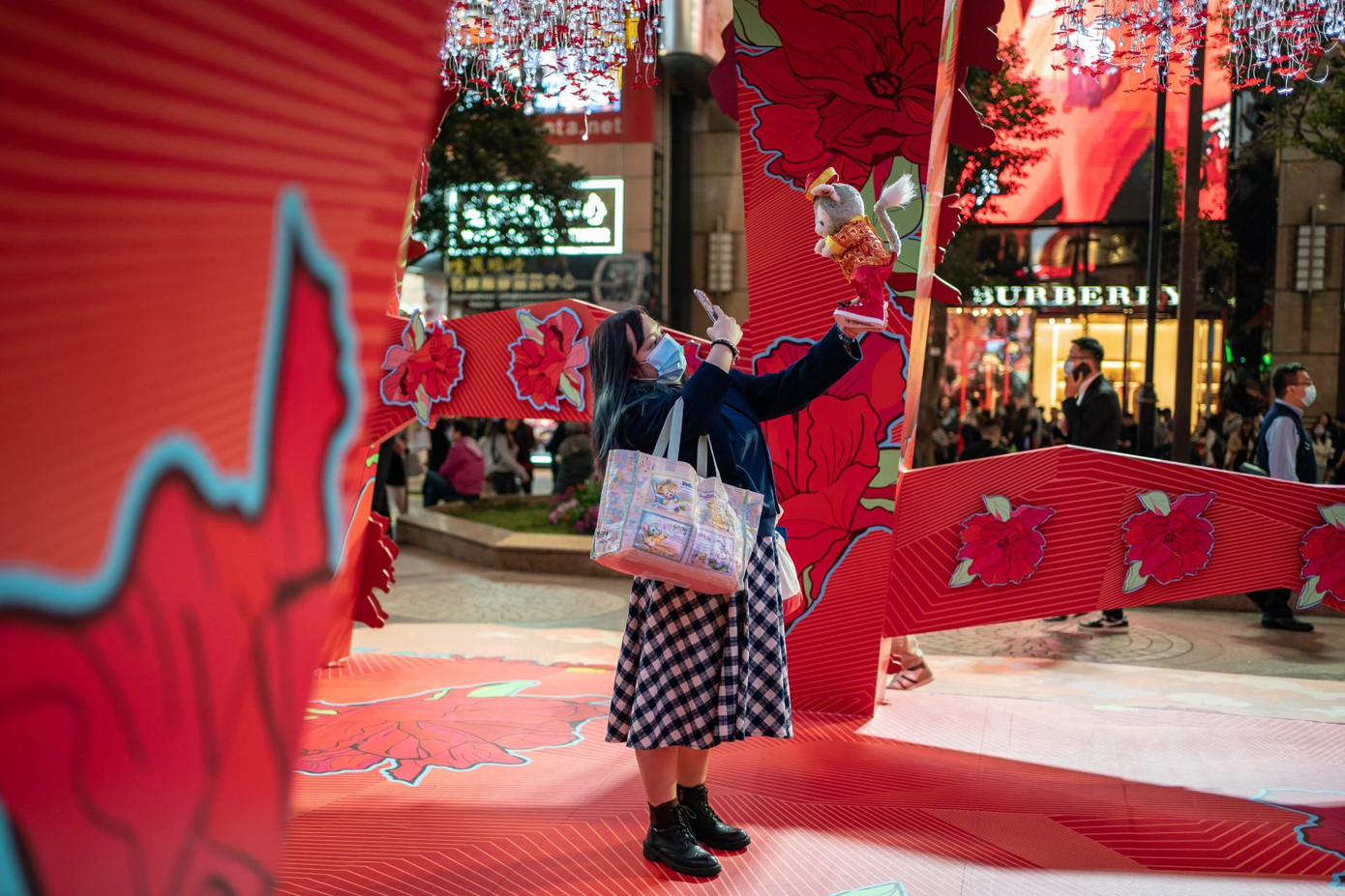 Một người đi bộ chụp ảnh bằng điện thoại di động của mình trước trang trí Tết Nguyên đán tại một trung tâm mua sắm ở Hong Kong (Trung Quốc. Ảnh: Getty