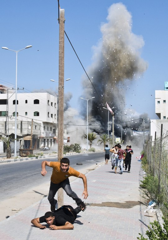 Những người Palestine vội vã chạy khỏi hiện trường khi một quả bom trong cuộc không kích của Israel trúng một ngôi nhà tại thành phố Gaza ngày 23/8. Máy bay chiến đấu của Israel đã tàn phá Gaza, thậm chí cuộc không kích còn khiến 5 người trong cùng một gia đình Palestine thiệt mạng, trong đó có hai trẻ em.