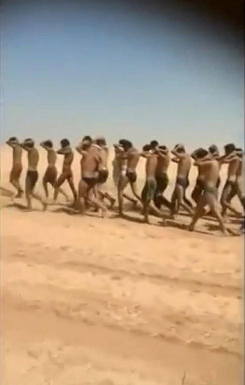 Hình ảnh từ một đoạn video đăng tải trên mạng xã hội ngày 28/8 cho thấy, hàng dài các binh sỹ thuộc căn cứ không quân của Syria bị lực lượng phiến quân Hồi giáo IS lột sạch đồ, chỉ mặc đồ lót và áp tải trên sa mạc trước những cuộc hành quyết kinh hoàng ngày 27/8. Nhóm phiến quân IS đã hành quyết hơn 160 binh sỹ Syria.