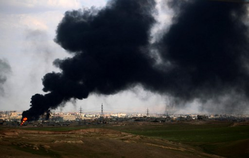 Những cột khói bốc lên ở Musharifah, tây bắc thành phố Mosul, Iraq hôm 4/5 trong trận quyết chiến của lược lượng chính phủ Iraq nhằm giải phóng thành phố khỏi tay phiến quân Nhà nước Hồi giáo tự xưng (IS)