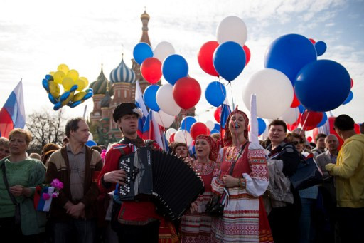 Các thành viên của Công Đoàn Nga cầm bóng bay diễu hành ở Moscow nhân ngày Quốc tế Lao động 1/5