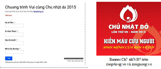 Bước 1: Truy cập trang Tienphong.vn hoặc Tamguong.vn, Click vào banner Chủ nhật Đỏ 2015, Điền thông tin vào bảng tham dự chương trình gồm các thông tin theo bảng dưới tại đây: http://goo.gl/forms/CmDiv0YLPg