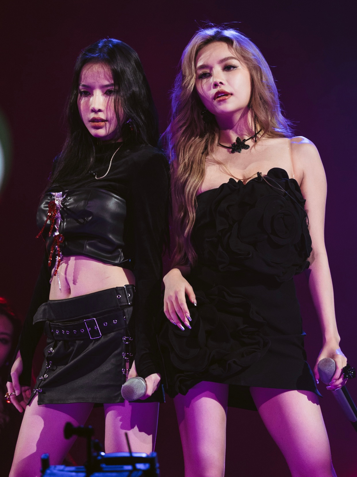 | LyLy và An Kỳ mặc đồ "ton-sur-ton" trên sân khấu. |