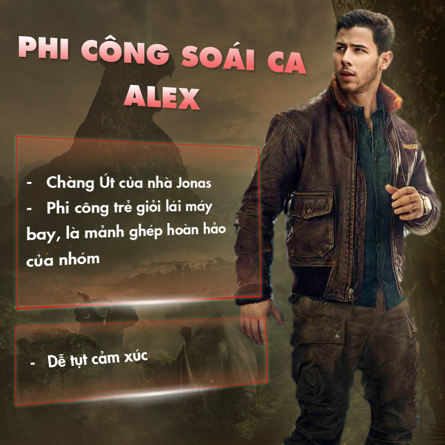 Bên cạnh các nhân vật thú vị của game, trong thế giới kỳ ảo ấy còn có sự xuất hiện của chàng phi công Alex do Nick Jonas đóng. Từng là một người chơi như nhóm học sinh, anh đã bị kẹt tại thế giới game và đang tìm cách thoát khỏi đó. Với nhiều kinh nghiệm sinh tồn, Alex sẽ hỗ trợ 4 nhân vật trên vượt qua các ải trong thế giới Jumanji để trở về thực tại.