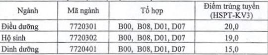 Theo đó, ngành Điều dưỡng có mức điểm chuẩn là 20; ngành Hộ sinh có mức điểm chuẩn là 19 và ngành Dinh dưỡng có điểm chuẩn là 15.