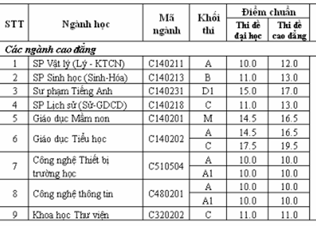 | Ngành học | Mã ngành | Khối thi | Điểm trúng tuyển | ||