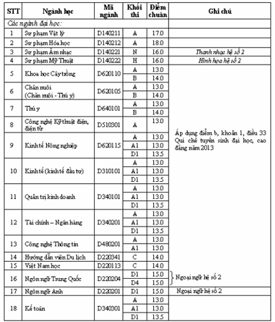 Theo đó, điểm trúng tuyển ĐH Kinh tế và Quản trị Kinh doanh điểm chuẩn các ngành chỉ ở mức 13,5-14,5 điểm; ĐH Kĩ thuật Công nghiệp điểm dao động từ 13-17,5 điểm; ĐH Nông Lâm điểm chuẩn chỉ từ 13-14 điểm; ĐH Sư phạm điểm chuẩn vào các ngành chỉ từ 16-23 điểm; ĐH Khoa học điểm chuẩn các ngành là 13-15 điểm; Khoa Ngoại ngữ điểm chuẩn các ngành bằng điểm sàn, riêng ngành Sư phạm Tiếng trung Quốc (khối D1) lấy điểm chuẩn 19,5;..