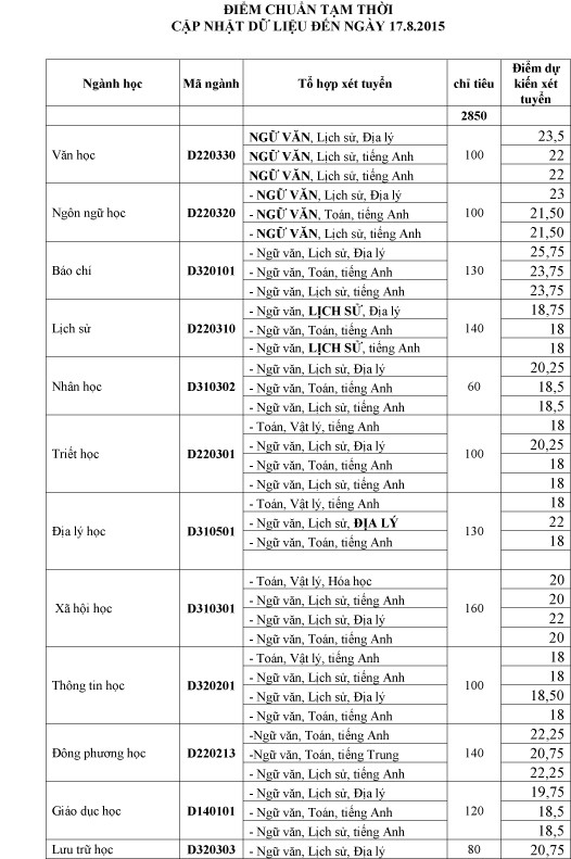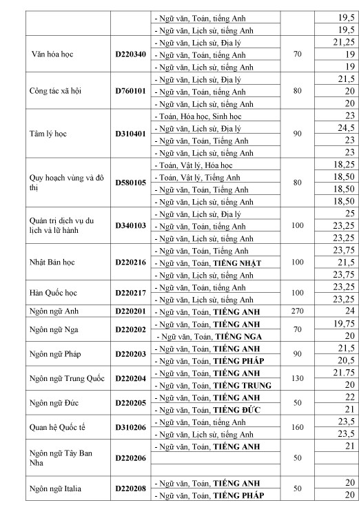 ĐH Khoa học Xã hội và Nhân văn (ĐH Quốc gia TPHCM) cũng công bố điểm chuẩn dự kiến vào trường. Theo đó, điểm chuẩn dao động từ 18 đến 24 điểm.