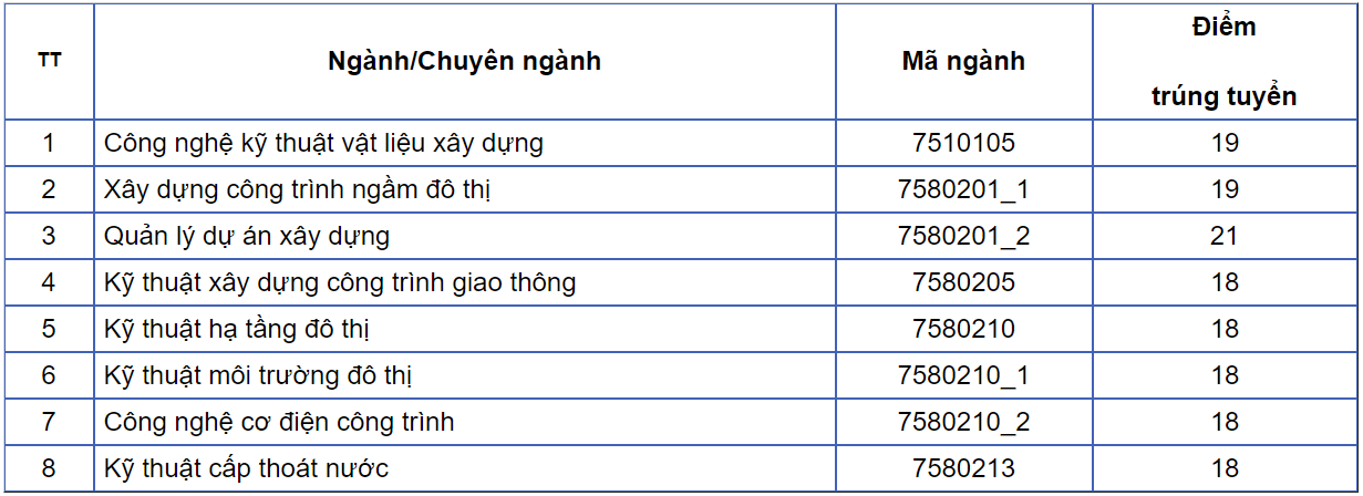 Đại học Kiến trúc Hà Nội công bố điểm trúng tuyển với phương thức xét tuyển bằng học bạ THPT. Theo đó, 7 trên 8 ngành lấy điểm 18 - 19, duy nhất Quản lý dự án xây dựng có điểm chuẩn 21.