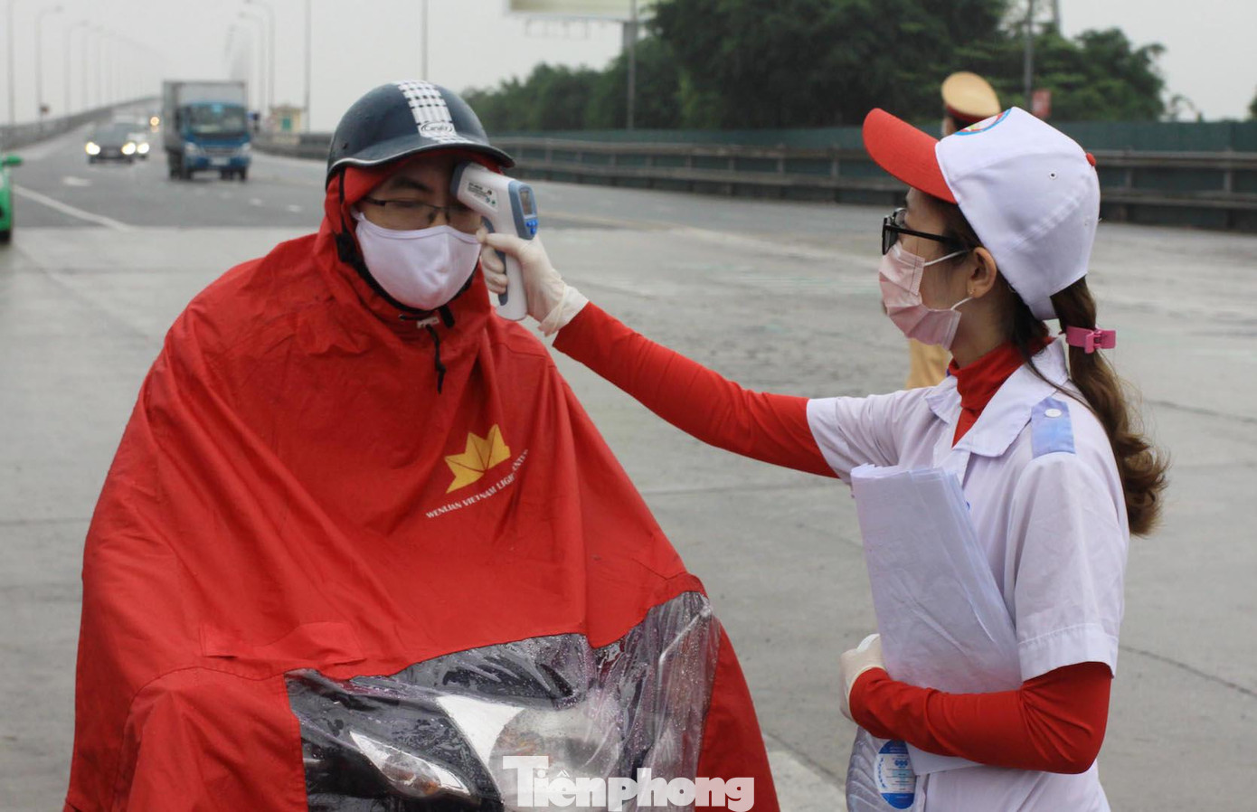 | Tiến hành kiểm tra y tế và khai báo y tế bắt buộc đối với người từ các tỉnh ngoài vào Thái Bình tại cửa ngõ Cầu Đò Quan - Ảnh: Hoàng Long |