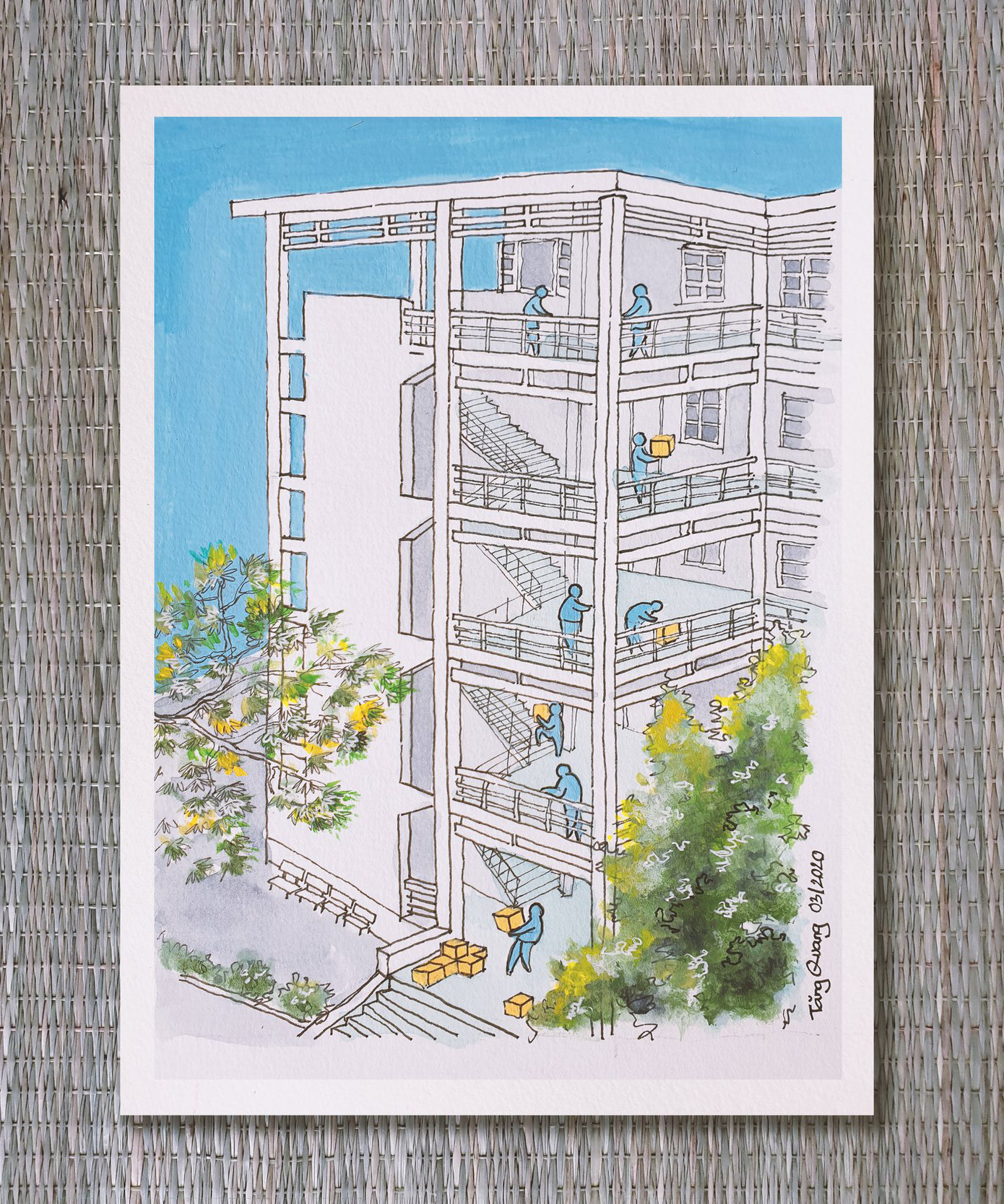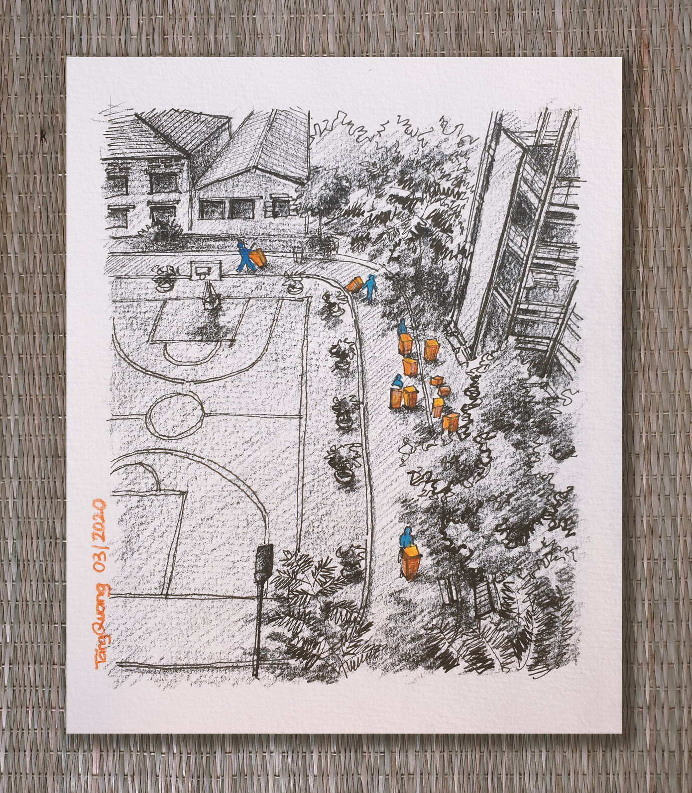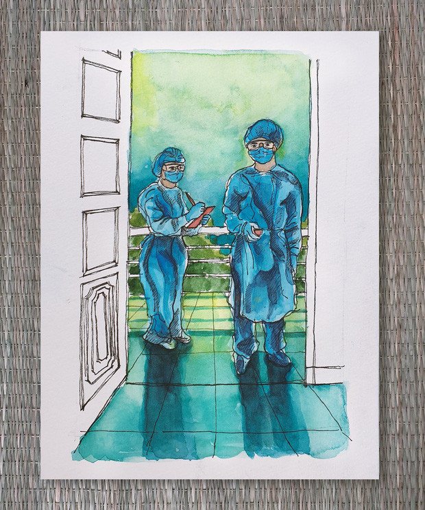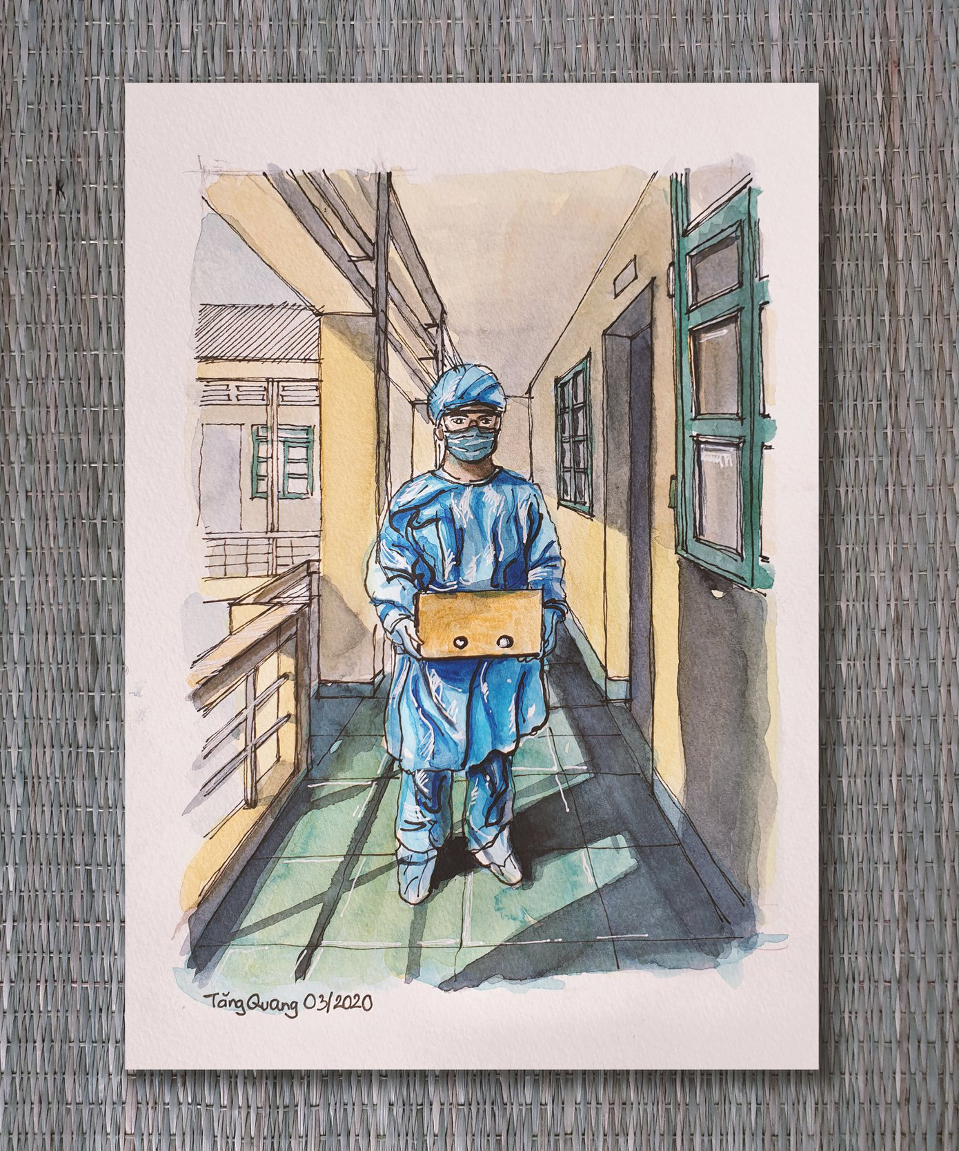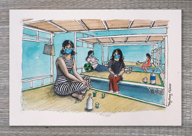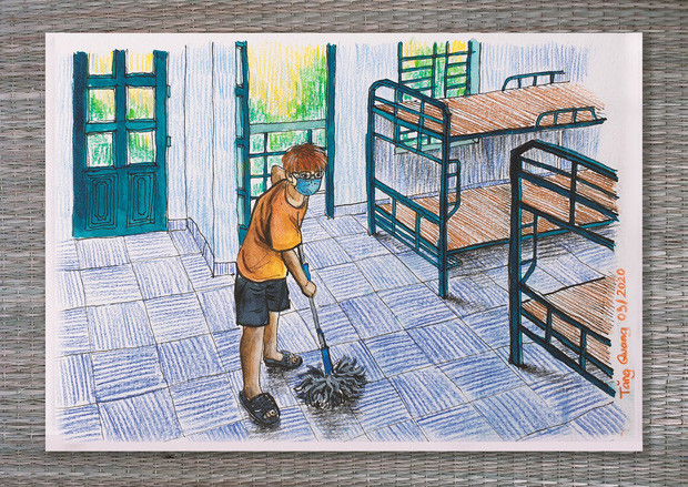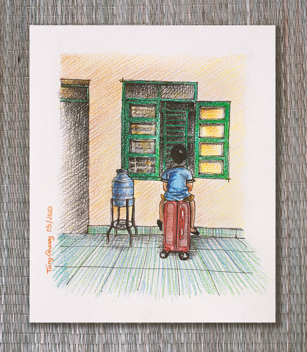 Tăng Quang vui vẻ chia sẻ: “Còn mấy ngày nữa là được tái hòa nhập cộng đồng, thú thật là trước khi về Việt Nam mình cũng có lo lắng vì cách ly tập trung. Nhưng cuộc sống những ngày qua khiến mình rất biết ơn và cảm kích. Không chỉ bản thân mình, mọi người ở những phòng bên đều rất trân trọng khoảng thời gian này. Mình cảm thấy may mắn khi được ở tại trường quân khu 7, được các bác sỹ và anh chị em chiến sỹ chăm sóc tận tình từ sức khỏe, bữa ăn cho đến nhu cầu cá nhân”. Nhân khoảng thời gian đặc biệt có một không hai trong cuộc đời này, anh chàng du học sinh Anh ngành Kiến trúc đã lưu lại kỷ niệm bằng bộ tranh mang tên “Quarantine Holidays” (kỳ nghỉ trong khu cách ly). Bộ ảnh là chuỗi những hình ảnh thường ngày ở khu cách ly bằng những nét vẽ mộc mạc, giản dị nhưng vô cùng đáng yêu và bắt mắt. Dưới đây là những chia sẻ của Tăng Quang: "Vớ được gì thì mình vẽ bằng cái đó, mình thực hiện bộ tranh chỉ với vài ba cây bút chì màu, hộp màu nước và hai cây bút kim".