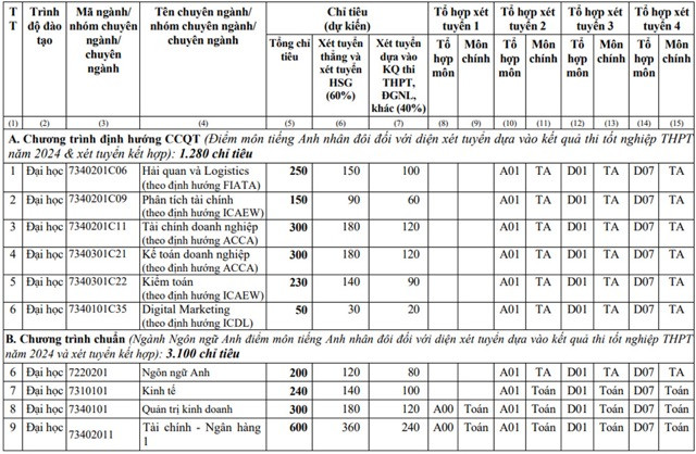 Năm nay, trường tuyển tổng chỉ tiêu là 4.500 theo 5 phương thức: Xét tuyển thẳng và ưu tiên xét tuyển theo quy chế của Bộ GDĐT; xét tuyển học sinh giỏi dựa vào kết quả học tập THPT; xét tuyển dựa vào kết quả thi tốt nghiệp THPT năm 2024; xét tuyển kết hợp chứng chỉ tiếng Anh quốc tế với kết quả thi tốt nghiệp THPT năm 2024; xét tuyển dựa vào kết quả kỳ thi đánh giá năng lực của Đại học Quốc gia Hà Nội và đánh giá tư duy của Đại học Bách khoa Hà Nội năm 2024.