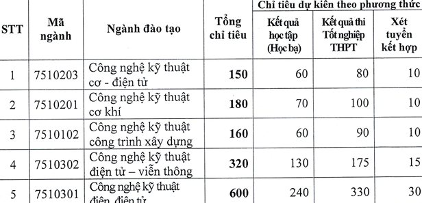 Nhà trường sử dụng 4 tổ hợp gồm: A00 (Toán, Vật lý, Hóa học); A01 (Toán, Vật lý; tiếng Anh); D07 (Toán; Hóa học; tiếng Anh); D01 (Toán; Ngữ văn; tiếng Anh).