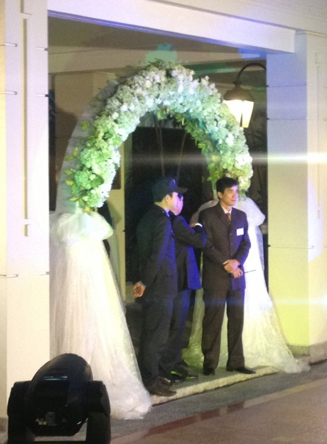 | Cổng hoa của tiệc cưới gồm 2 màu trắng và xanh rất nhẹ nhàng, dễ thương. Từ hơn 17h, quan khách lần lượt có mặt dù theo tiệp mời, 18h hôn lễ mới chính thức bắt đầu. . |