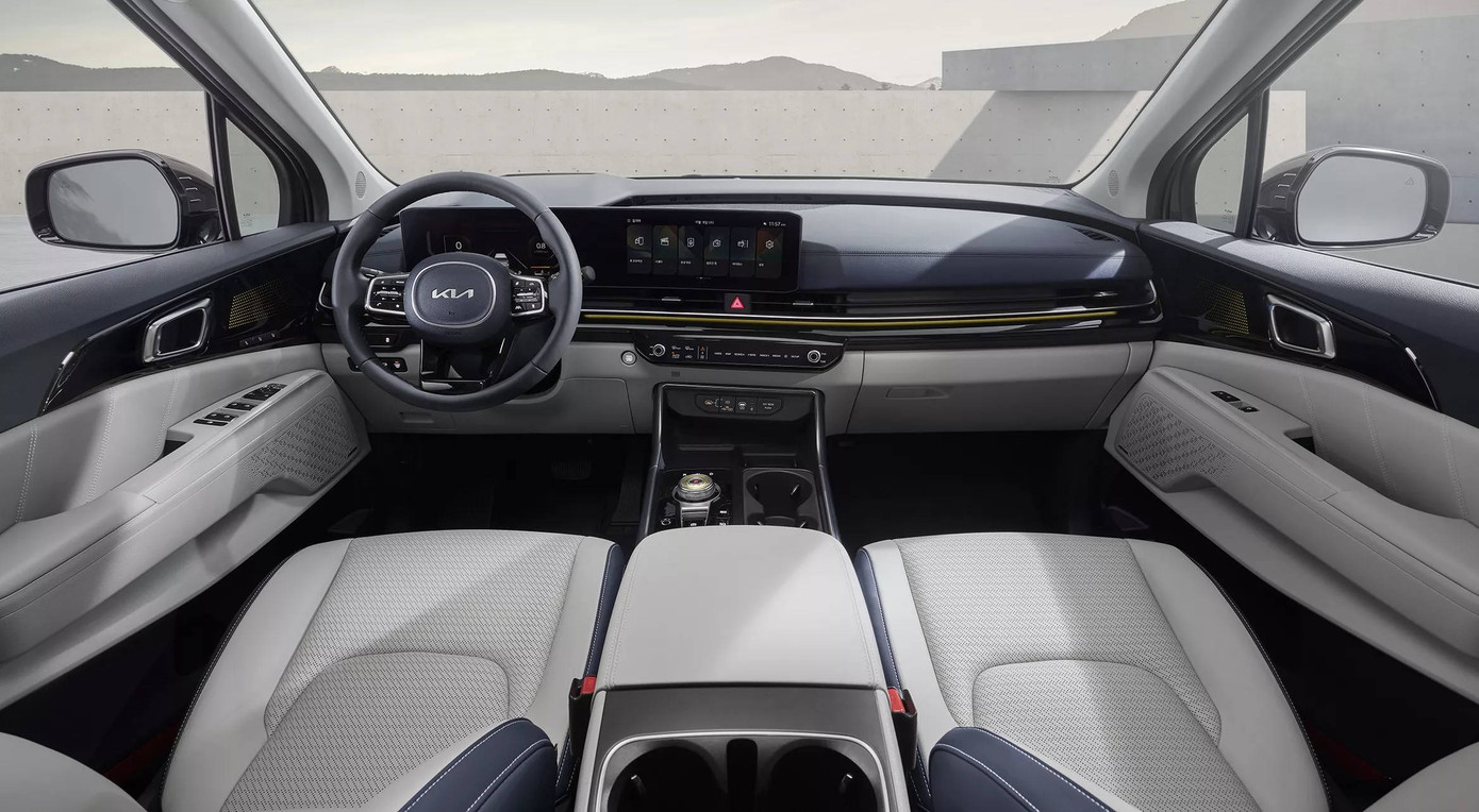 Tương tự với thiết kế bên ngoài, không gian bên trong xe của Carnival 2024 cũng đã được Kia thực hiện khá nhiều tinh chỉnh. Hệ thống màn hình hiển thị thông số và màn hình thông tin giải trí được nối liền nhau và thiết kế cong. Mỗi màn hình này có kích thước 12,3 inch.