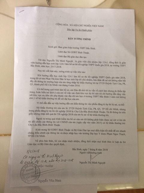 Theo ông Chung, nguyên do của sự việc này là lúc làm phiếu đăng ký xét tuyển, giáo viên chủ nhiệm đã hướng dẫn Đào đăng ký thông tin theo nơi thường trú chứ không phải theo thông tin trên hộ khẩu. Sự việc này mới đây đã được giáo viên chủ nhiệm của em tường trình sự việc với lãnh đạo nhà trường và Sở GD&ĐT Bình Thuận.