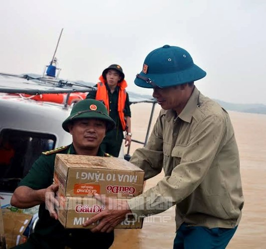 Bộ CHQS tỉnh Quảng Bình trao mì tôm cứu trợ cho người dân.