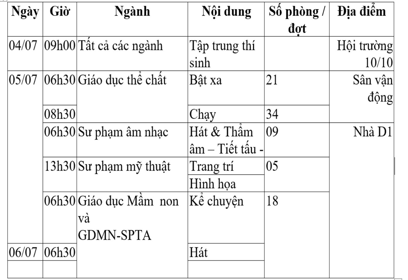 Theo đề án tuyển sinh của Nhà trường, Kỳ thi các môn năng khiếu nhằm giúp thí sinh có nguyện vọng theo học các ngành Giáo dục thể chất, Sư phạm Âm nhạc, Sư phạm Mỹ thuật và Giáo dục Mầm non (kể cả Giáo dục mầm non - Sư phạm tiếng Anh) có đủ điều kiện để đăng ký xét tuyển vào trường.