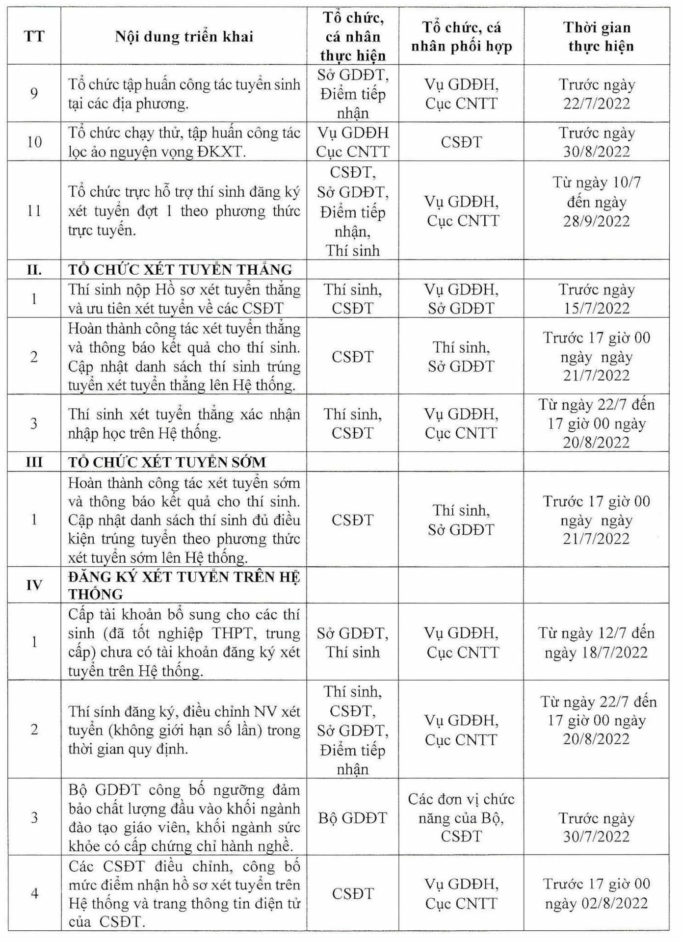 Để đảm bảo công tác tuyển sinh năm 2022 diễn ra an toàn, nghiêm túc, khách quan, đúng quy chế; tạo điều kiện thuận lợi cho thí sinh và các cơ sở đào tạo, Bộ GD&ĐT yêu cầu các cơ sở giáo đào tạo phải xây dựng kế hoạch triển khai cụ thể, trong đó phải đảm bảo: thống nhất với kế hoạch vừa được Bộ GD&ĐT ban hành và được công khai, minh bạch để xã hội, cơ quan quản lý giám sát; đảm bảo công bằng đối với tất cả các thí sinh tham gia dự tuyển.
