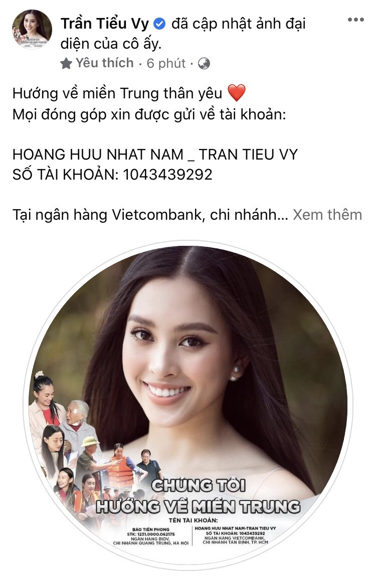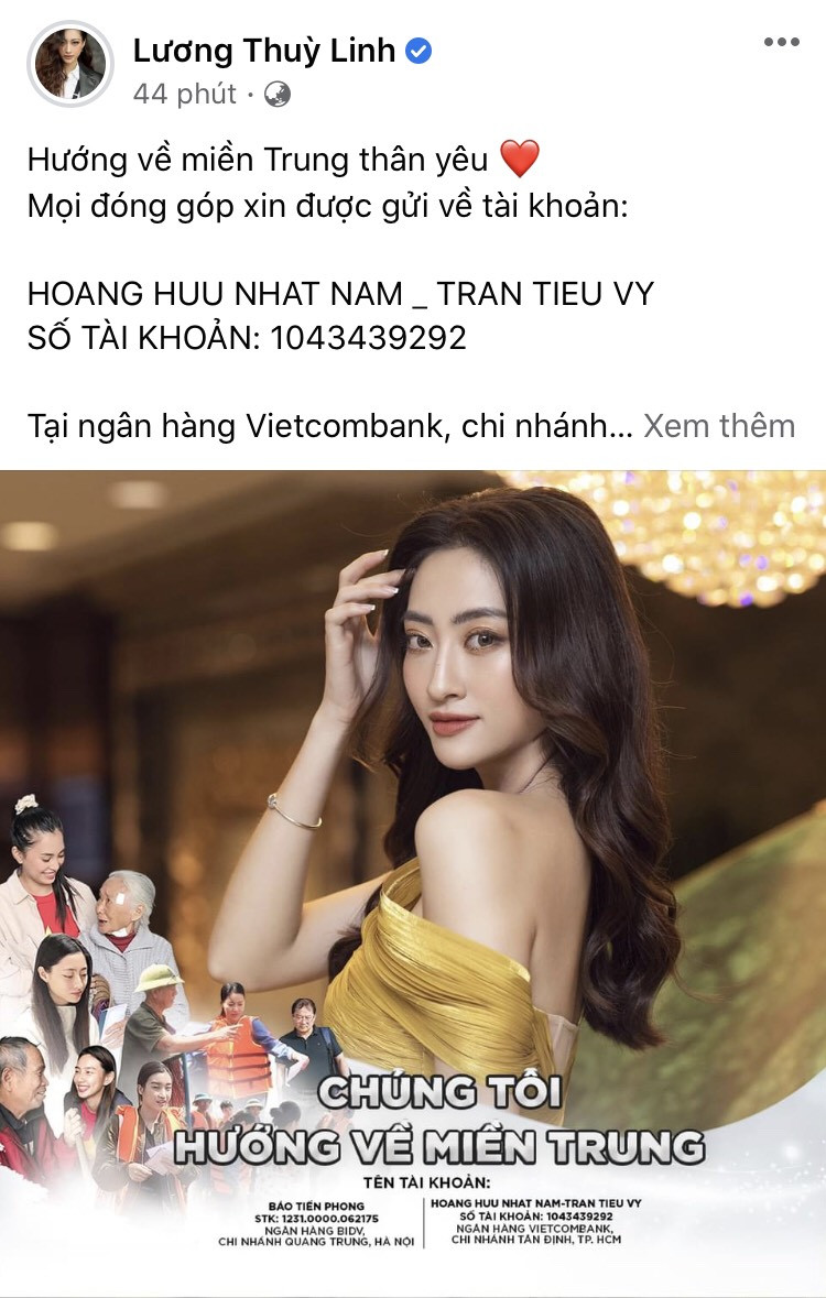 Những cơn bão đi qua để lại nhiều thiệt hại nặng nề cho đồng bào miền Trung trong suốt thời gian dài. Hưởng ứng lời kêu gọi ủng hộ miền Trung, vừa qua BTC Hoa Hậu Việt Nam cùng Hoa hậu Đỗ Mỹ Linh, Hoa hậu Tiểu Vy, Hoa hậu Lương Thuỳ Linh và nhiều người đẹp khác đã trao hơn 2 tỷ đồng tiền mặt cùng nhiều nhu yếu phẩm khác đến tận tay người dân tại 3 tỉnh Thừa Thiên Huế - Quảng Trị - Quảng Bình.