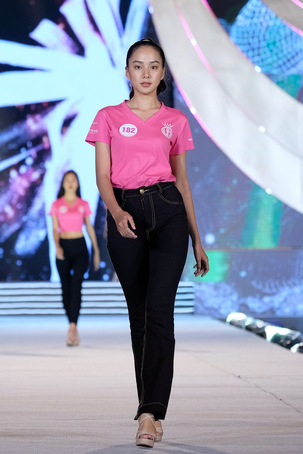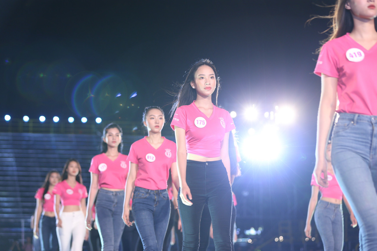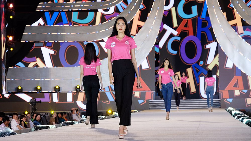 Trên sàn runway trải dài 40m, các cô gái lựa chọn trang phục quần jean ôm sát và áo phông đơn giản khoe vòng eo con kiến.