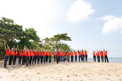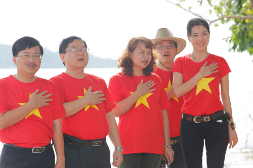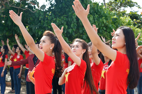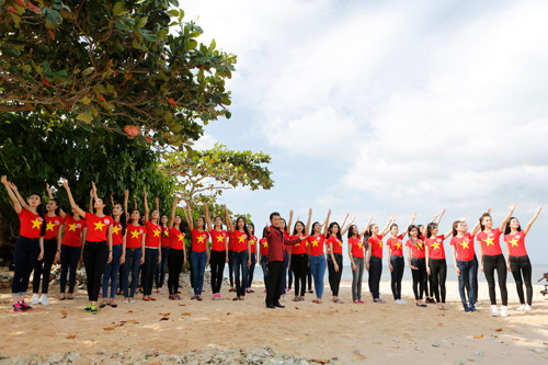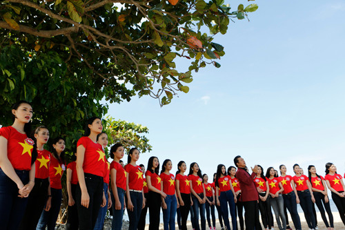 Trước đó, tối 23/11, dưới sự hướng dẫn của Nghệ sĩ ưu tú Tạ Minh Tâm, 38 thí sinh đã luyện tập và hát “Tổ quốc gọi tên mình" tại Vinpearl Resort Phú Quốc.