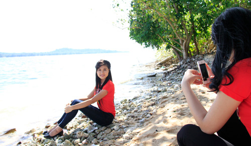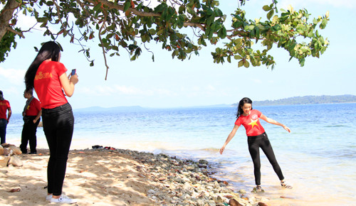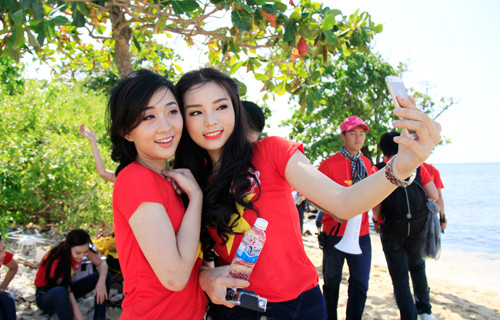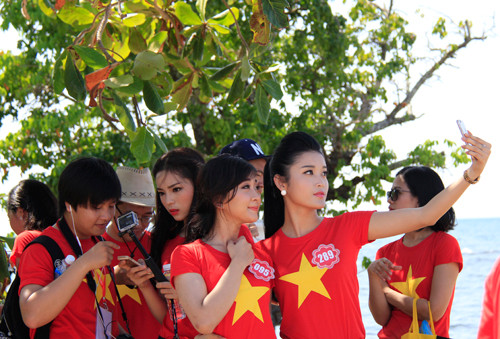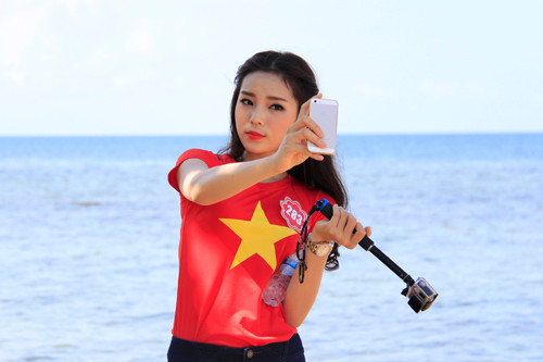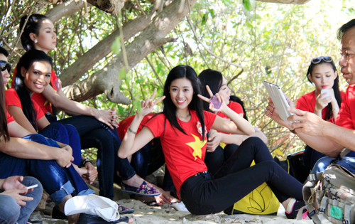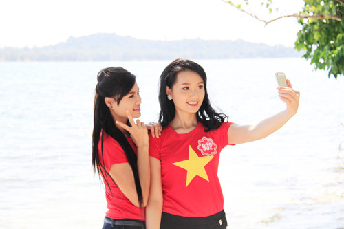 TPO - Tranh thủ giờ nghỉ giải lao giữa lúc quay MV “Tổ quốc gọi tên mình”, các thí sinh hoa hậu rủ nhau tạo dáng, chụp những hình ảnh tinh nghịch, tươi vui trên đảo. Nhiều thí sinh còn dùng cả “gậy tự sướng” của các nhiếp ảnh gia để chụp cho mình những bức hình ấn tượng.