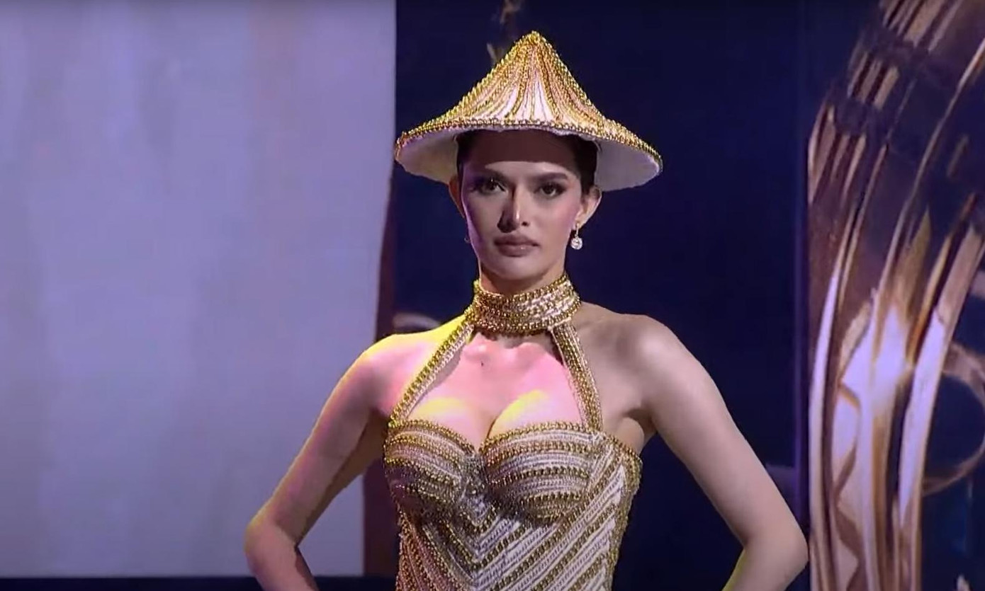 Theo đó, Gabrielle Camille Basiano trình diễn một bộ váy dát vàng cực kỳ lộng lẫy và gợi cảm. Điểm nhấn của bộ trang phục đó chính là chiếc nón giống với nón lá Việt Nam được đính kết cầu kỳ, lấp lánh.