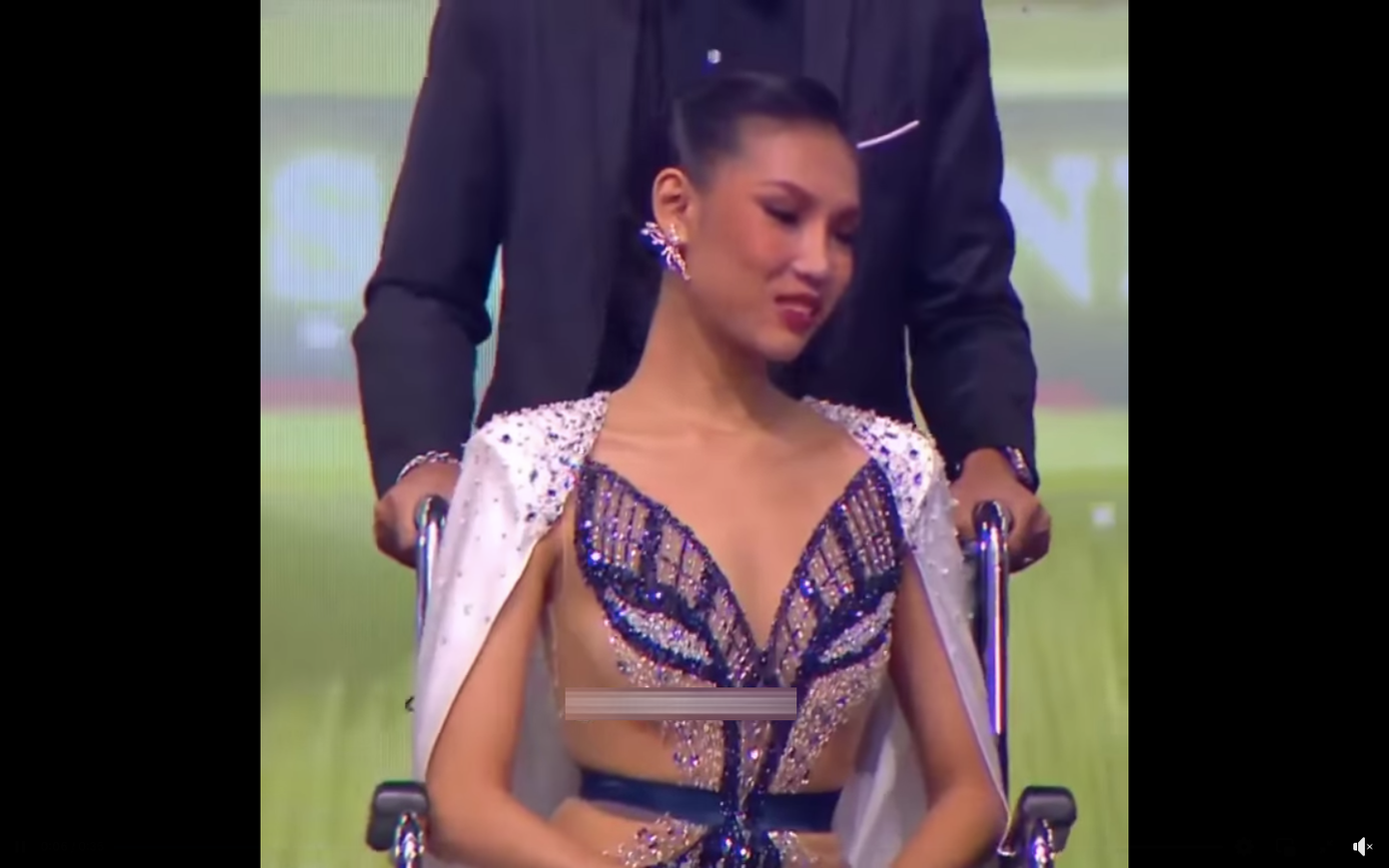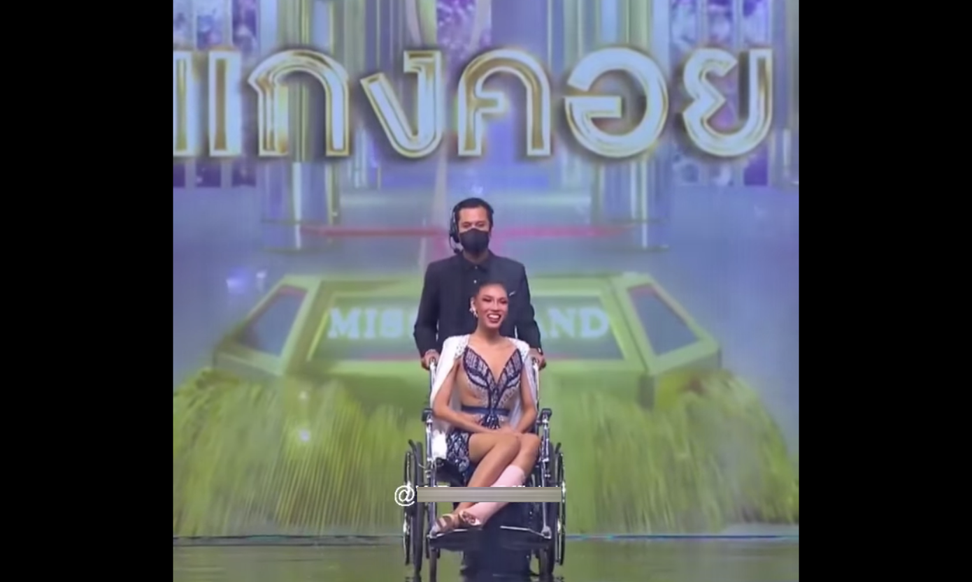 | Hình ảnh thí sinh của cuộc thi Miss Grand Saraburi ngồi xe lăn trong màn trình diễn váy dạ hội đang khiến các fans xôn xao. |