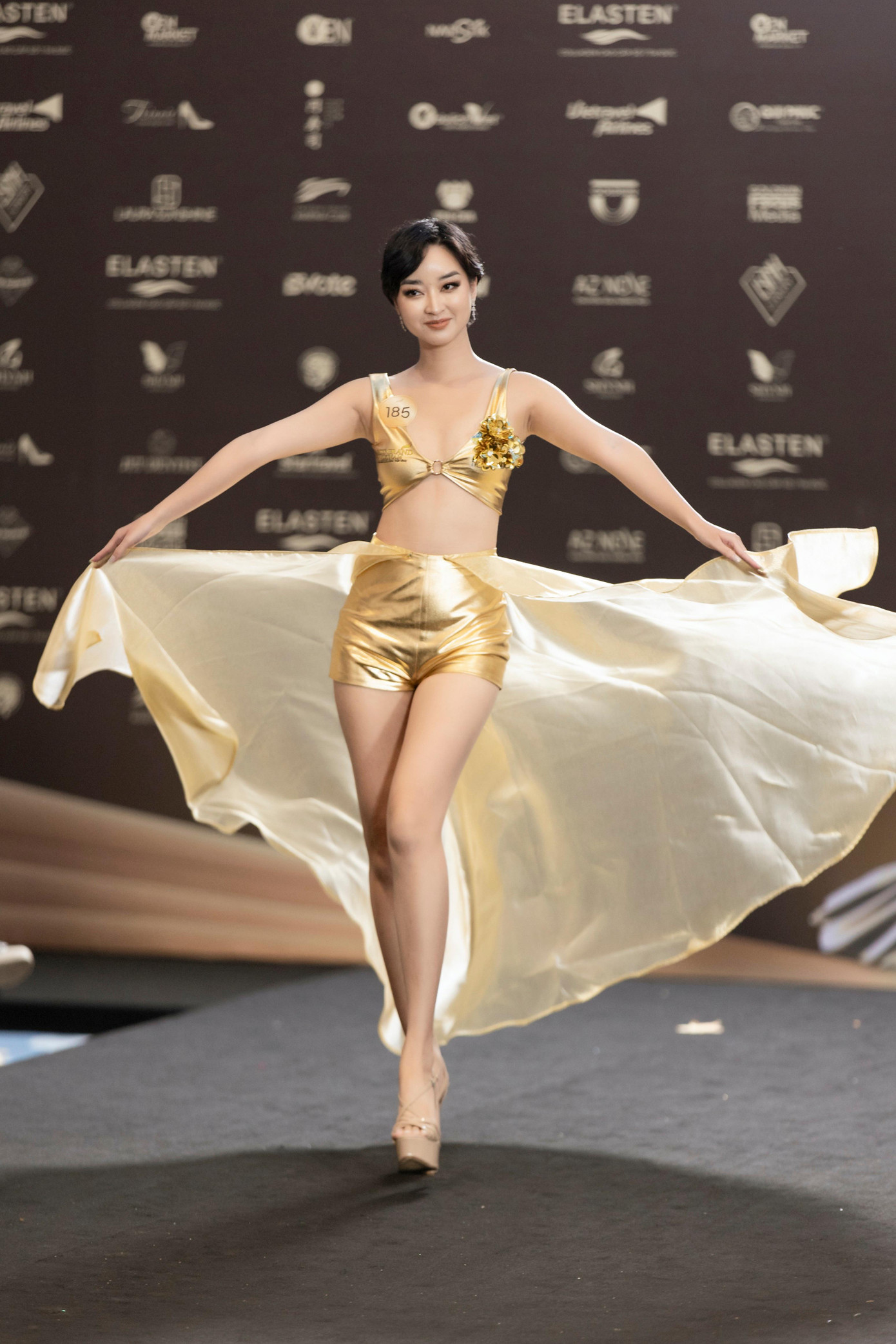 Các thí sinh mặc đồng phục có kiểu dáng thể thao mạnh mẽ kết hợp với phần tà bay bổng khi trình diễn catwalk và hô tên trước khi bước vào phần phỏng vấn với giám khảo.