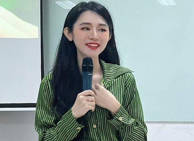 | Thúy Huyền được mời làm báo cáo viên tại Đại học Ngoại thương cơ sở TPHCM (Ảnh: NVCC). |