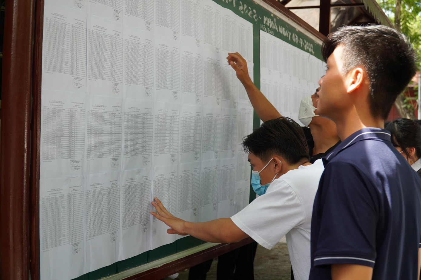 | Các thí sinh rà kỹ danh sách người dự thi và các thông tin liên quan trước khi bước vào phòng thi để nghe phổ biến quy chế thi tốt nghiệp. |