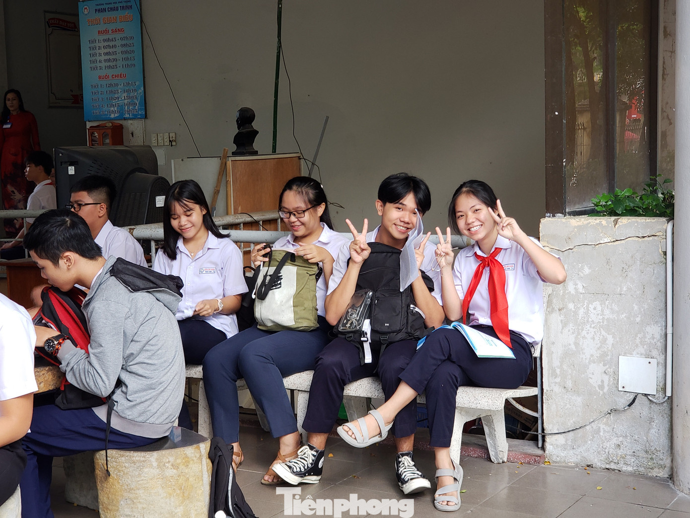 Nhiều thí sinh tranh thủ đến điểm trường sớm để xem lại bài vở cũng như trao đổi với bạn bè về đề thi của Hà Nội và TP Hồ Chí Minh.