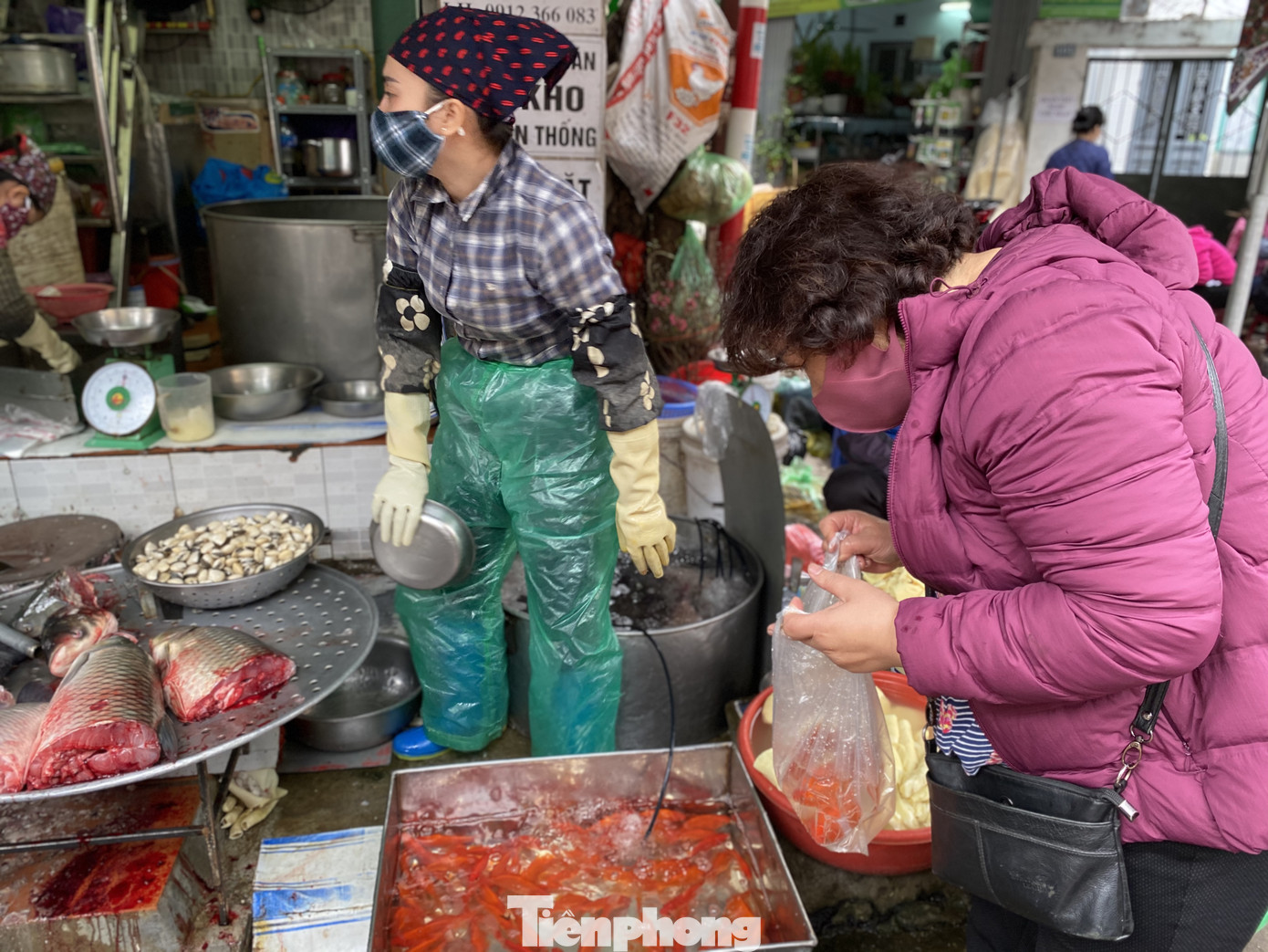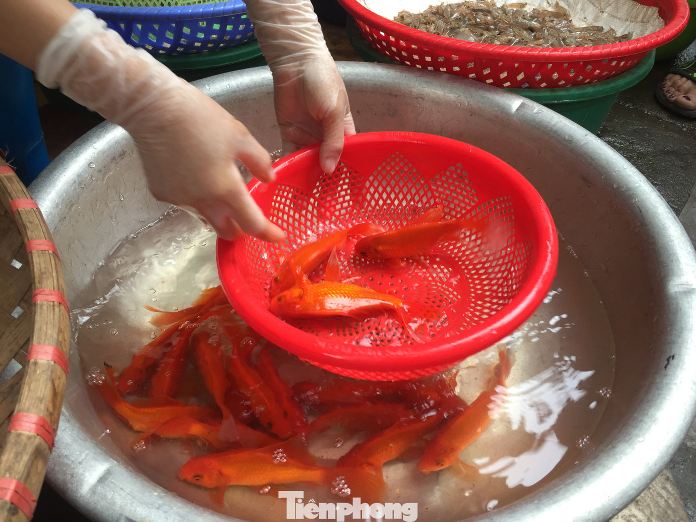 Không thể thiếu trong hôm nay, cá chép vàng, cá chép đỏ Tam Dương về chợ tiêu thụ lượng lớn trong buổi sáng. Sạp cá tại chợ Thái Hà (Hà Nội) bán 50.000 đồng/3 con, mức giá được nhiều người cho là đắt gấp đôi năm trước