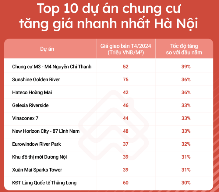 10 dự án chung cư được tìm kiếm nhiều nhất Hà Nội trong 4 tháng đầu năm 2024 là Vinhomes Ocean Park Gia Lâm, Vinhomes Smart City, Vinhomes Green Bay Mễ Trì, Khu đô thị Thanh Hà Mường Thanh, Khu đô thị mới Xa La, Khu đô thị Việt Hưng, Khu đô thị Trung Hòa - Nhân Chính, Khu đô thị Geleximco - Lê Trọng Tấn, Khu đô thị mới Văn Phú và Khu đô thị mới Linh Đàm. Phần lớn các dự án này có mức giá tương đối mềm với nguồn cung sơ cấp lớn và tập trung ở khu vực phía Tây.