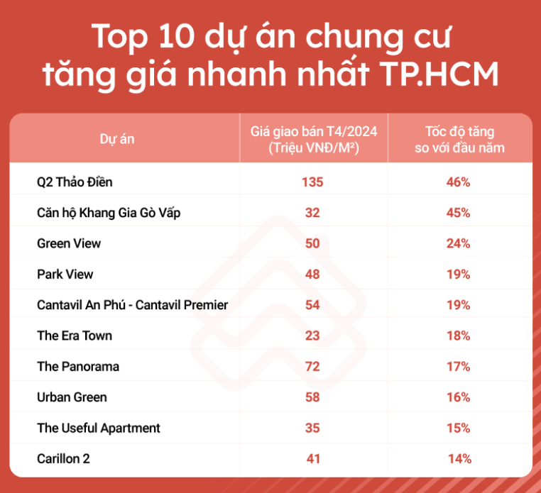 Ở TPHCM, một số dự án còn tăng giá rao bán trên 45% như chung cư Thảo Điền hay căn hộ Khang Gia Gò Vấp. Người tìm kiếm chung cư quan tâm nhiều nhất đến Vinhomes Grand Park, Vinhomes Central Park, Celadon City, Q7 Saigon Riverside, Mizuki Park, Masteri Thảo Điền, Vinhomes Golden River Ba Son, Sunrise City, Eco Green Sài Gòn, CityLand Park Hills. Danh sách này đa số là các dự án lớn, ở khu vực dân cư đông đúc.