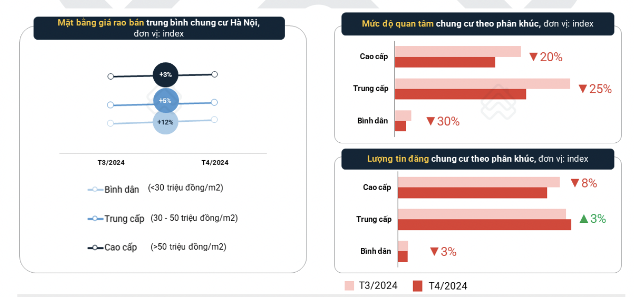 Dù lượng quan tâm đã giảm nhưng giá rao bán chung cư Hà Nội không có dấu hiệu đi xuống. Theo lịch sử giá của Batdongsan.com.vn, trong tháng 4/2024, phân khúc chung cư bình dân (dưới 30 triệu đồng/m2) tăng giá 12% so với tháng trước. Căn hộ trung cấp (30 - 50 triệu đồng/m2) cũng tăng 5% và cao cấp (trên 50 triệu đồng/m2) tăng 3%.