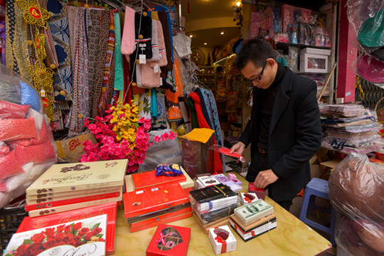 Chị Thu, chủ một cửa hàng, cho biết tuần trước rất đông khách, chủ yếu là các bạn trẻ mua chocolate, quà tặng, đồ trang trí Tết. "Đến hôm nay thì vắng rồi, chỉ còn một vài người tranh thủ ngày cuối đi làm trong năm Đinh Dậu qua đây mua hàng”, chị Thu nói.
