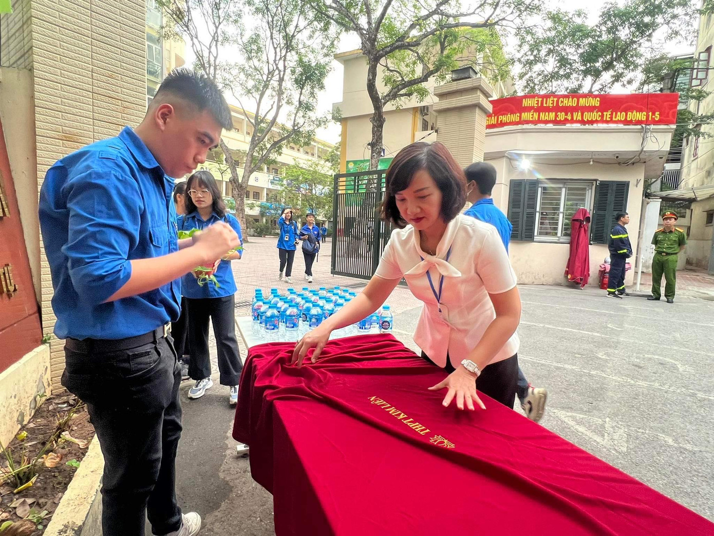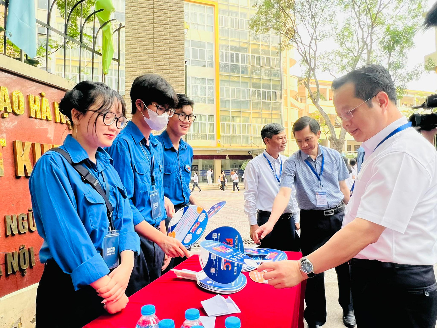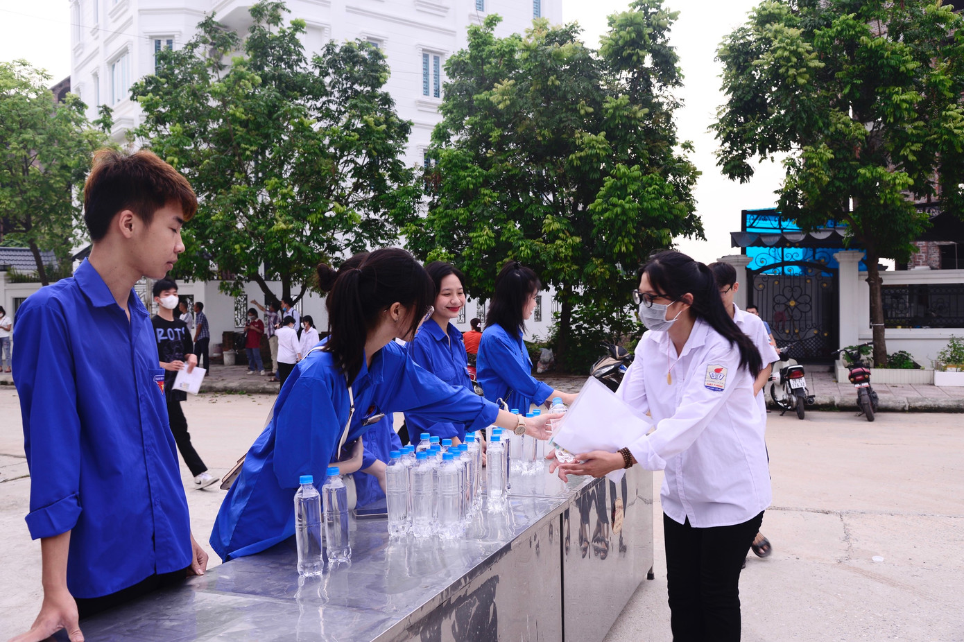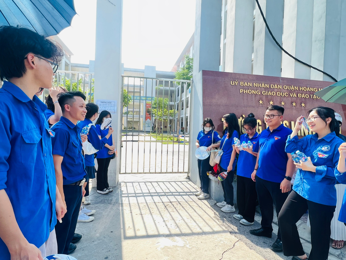 | Lực lượng thanh niên tình nguyện của trường phối hợp với Đoàn thanh niên quận triển khai các hoạt động hướng dẫn, hỗ trợ thí sinh, người nhà. |