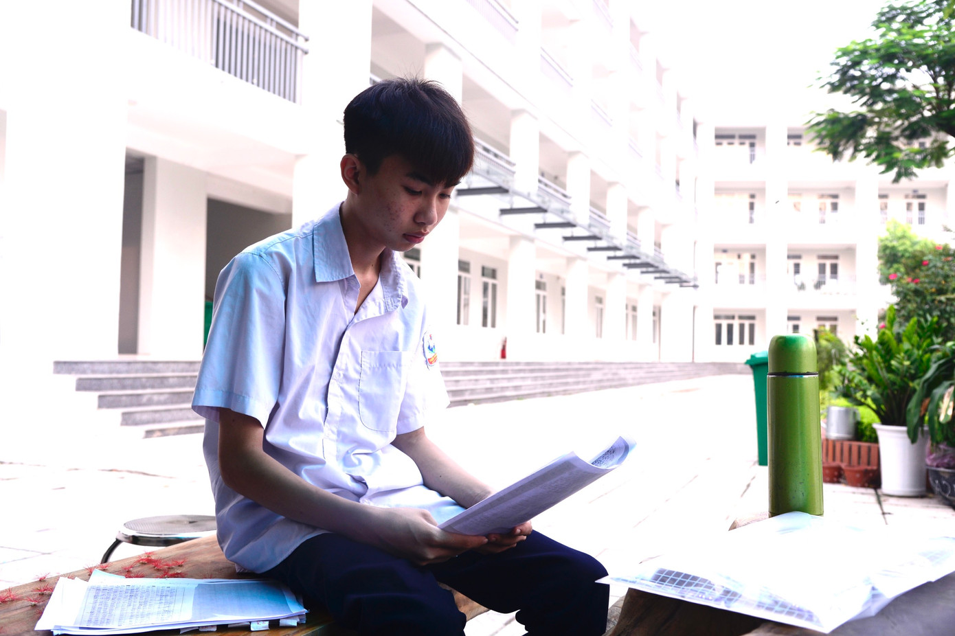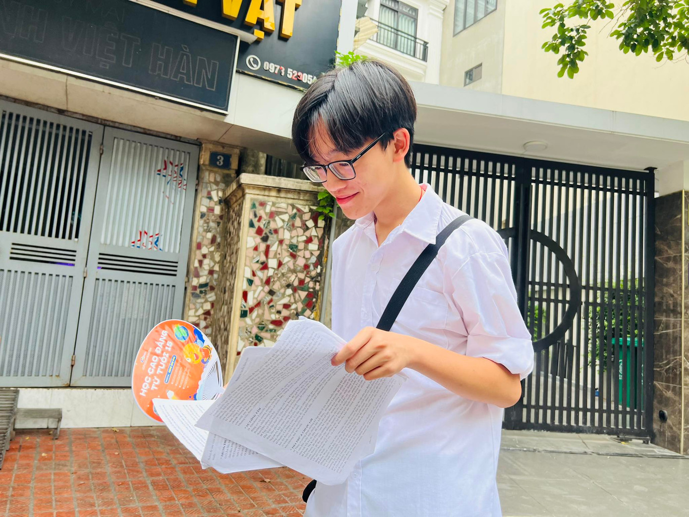 | Đỗ Đức Mạnh, học sinh Trường THCS Hoàng Mai tranh thủ ôn bài trước giờ vào phòng thi. |