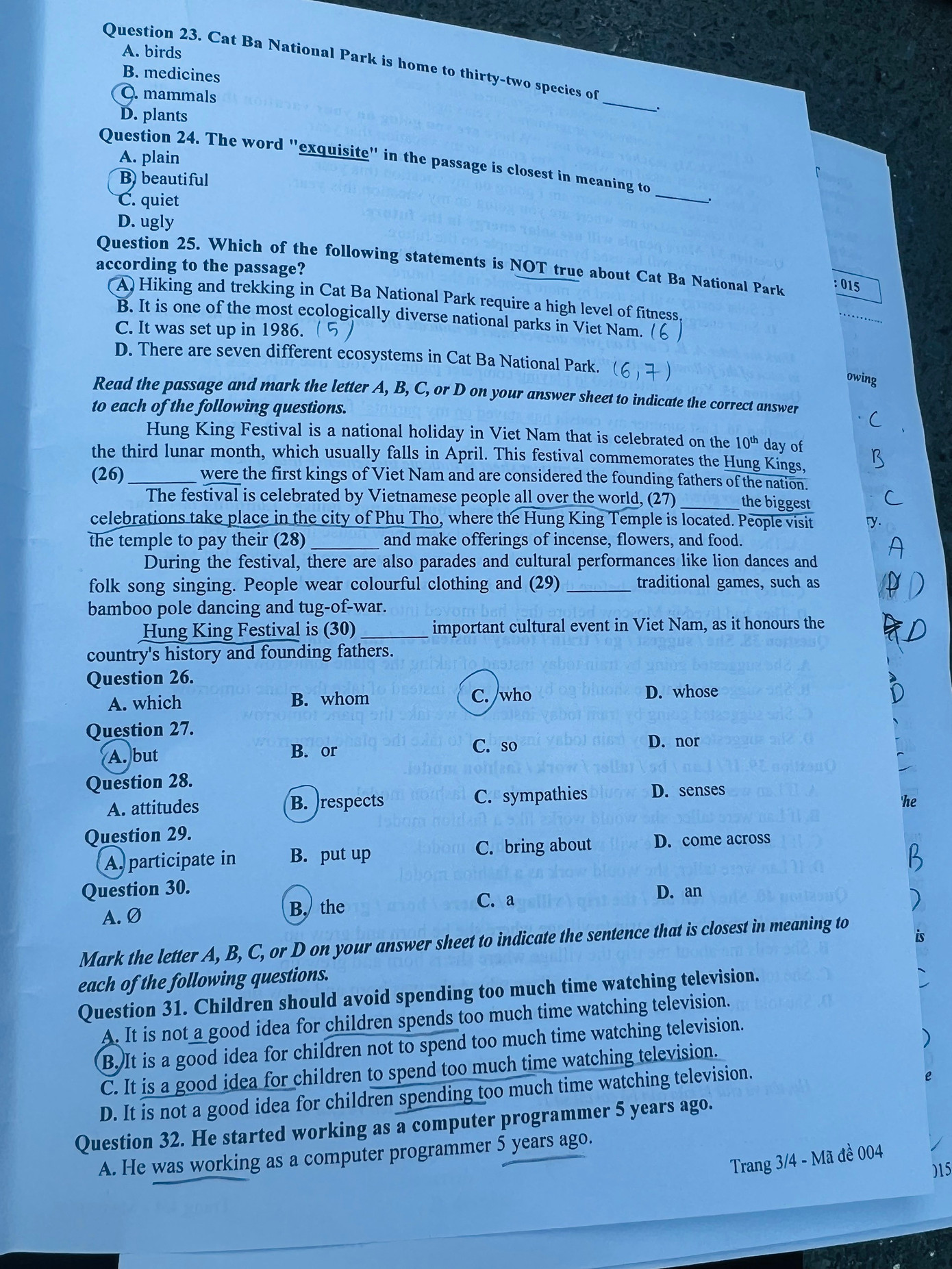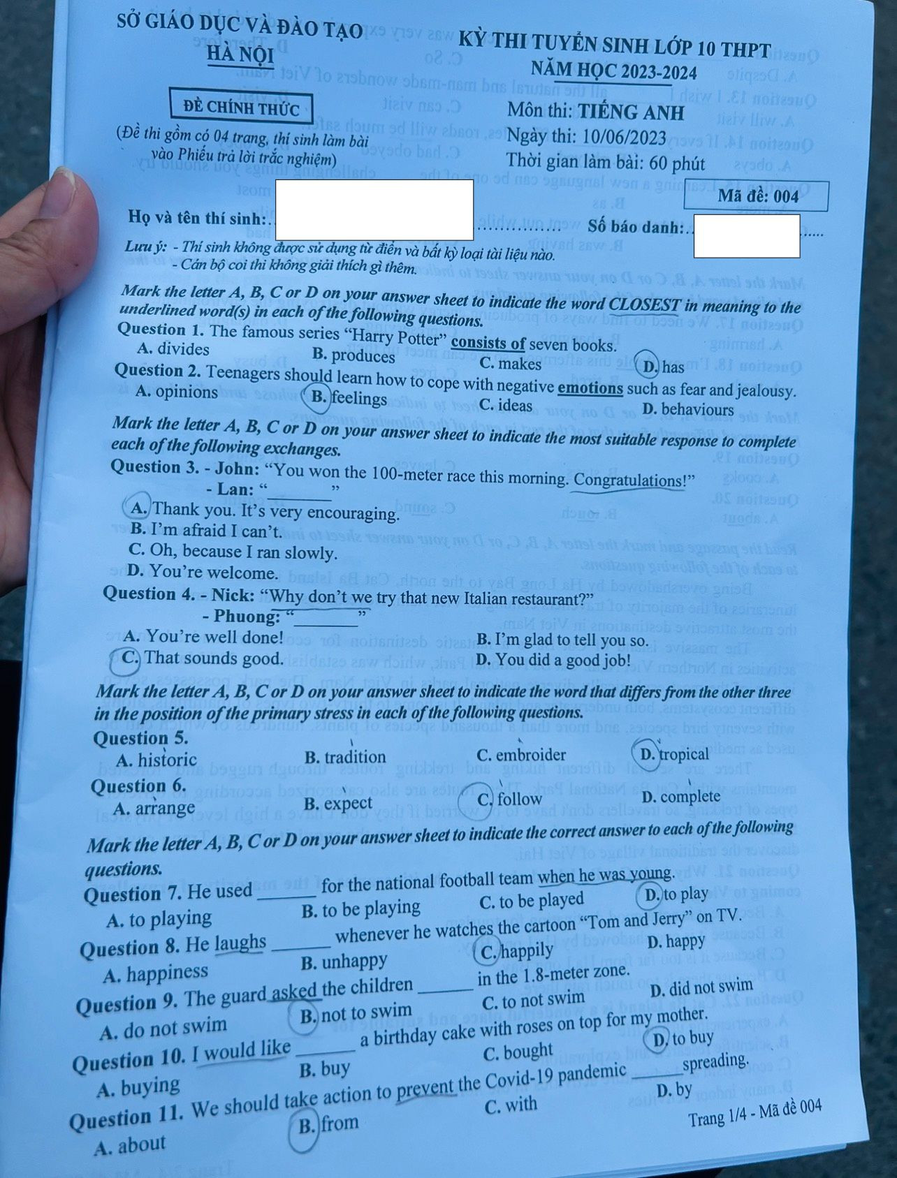 Theo nhiều thí sinh tại điểm thi THCS Linh Đàm, đề thi môn Ngoại ngữ gồm 40 câu trắc nghiệm, gồm kiến thức cơ bản, không quá khó.