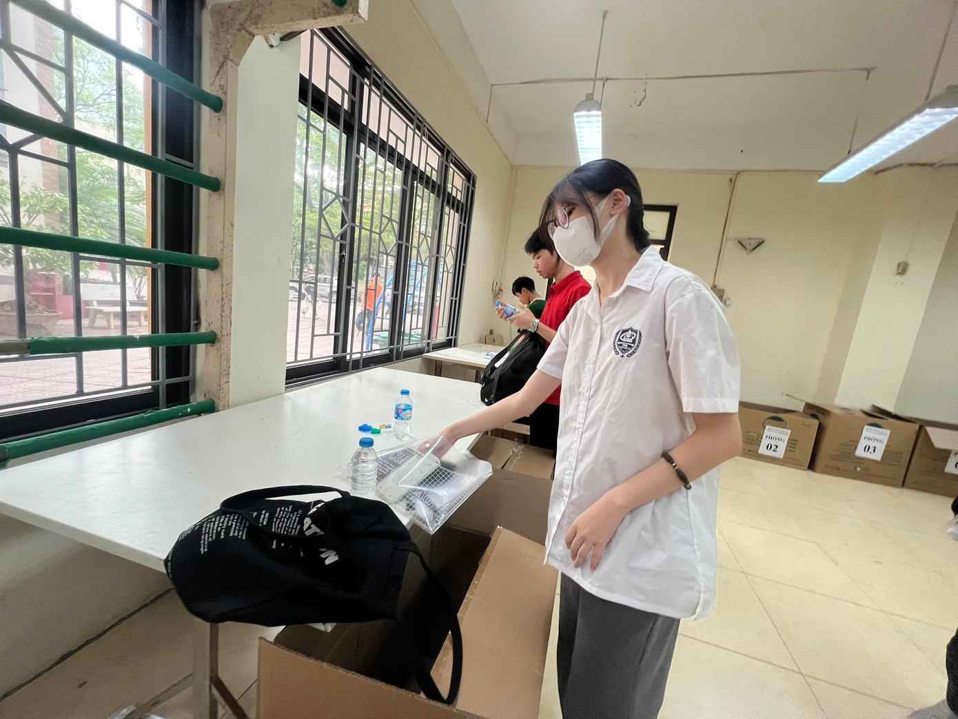 Bà Nguyễn Thị Hiền, Phó điểm trưởng điểm thi Trường THPT Kim Liên nhắc thí sinh trước khi vào phòng thi, thí sinh phải để toàn bộ đồ đạc, vật dụng cá nhân không được phép mang vào khu vực thi tại một khu vực riêng, cách xa phòng thi.