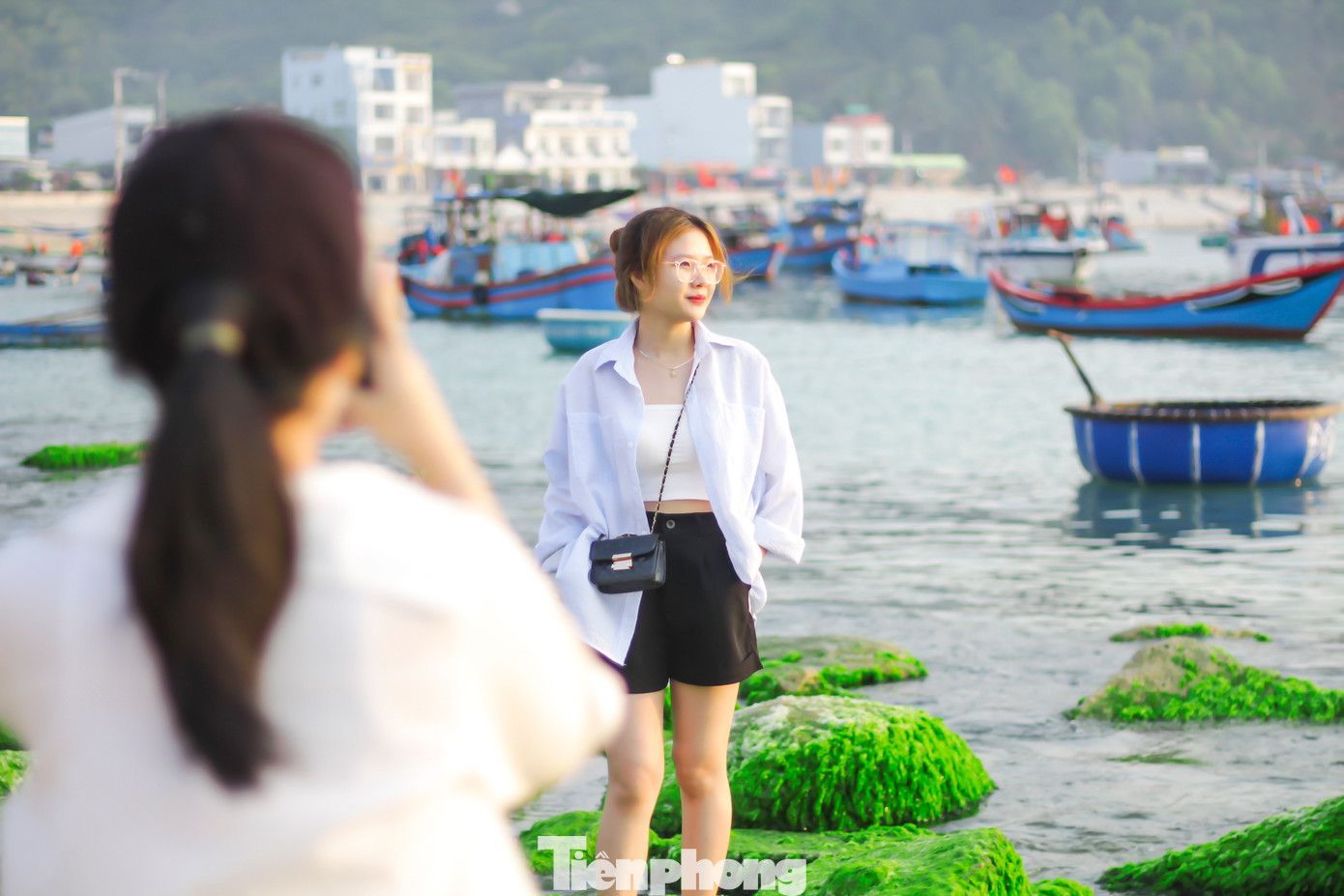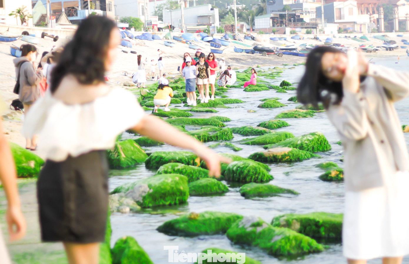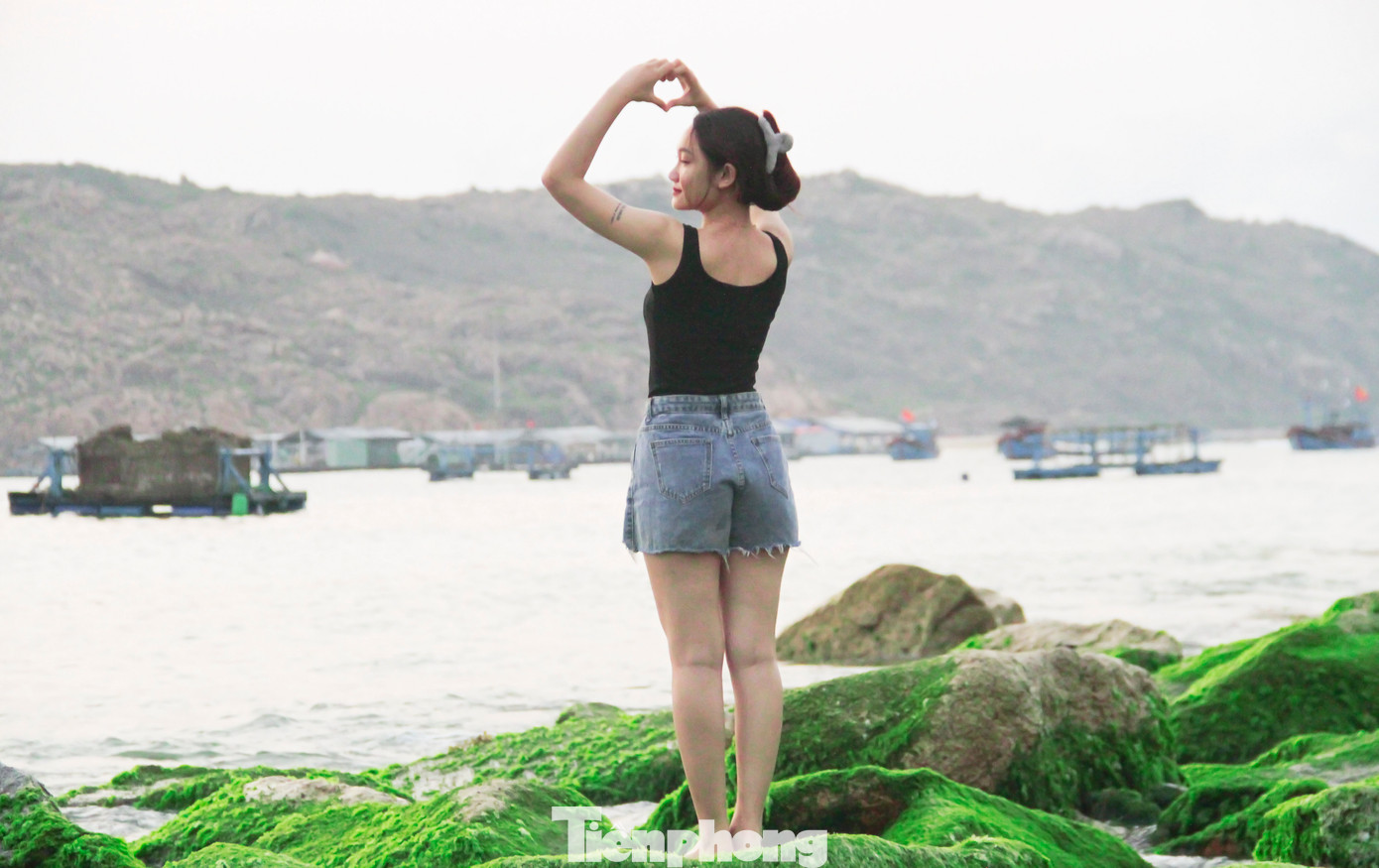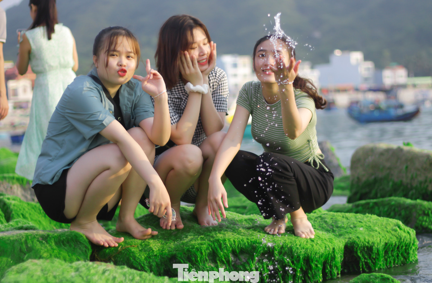 Người dân, du khách thích thú "check-in" với rêu xanh ở bán đảo Nhơn Hải. Ảnh: Trương Định