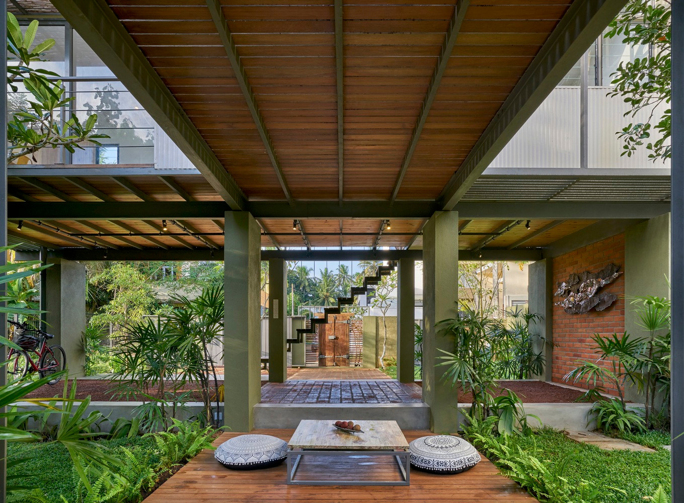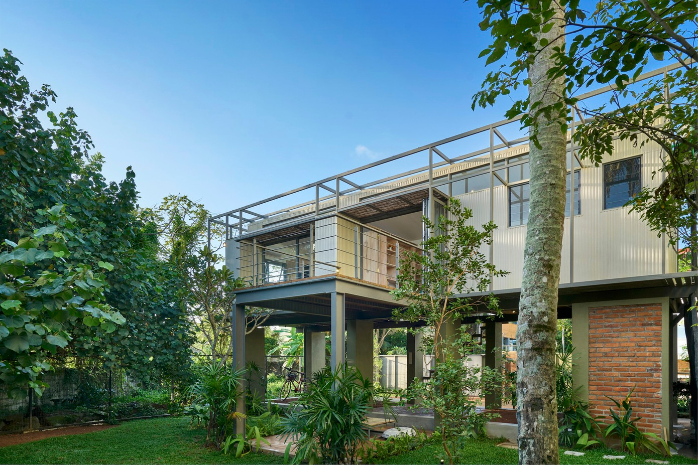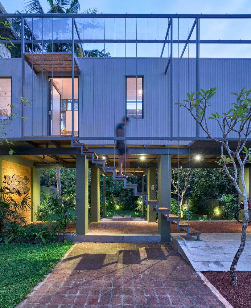 Ngôi nhà có kết cấu đặc biệt với tầng một chỉ có các trụ cọc, không tường bao, hoàn toàn thông mở với khu vườn, tầng hai là các phòng chức năng được xây dựng đơn giản từ khung thép và tấm vật liệu nhân tạo.