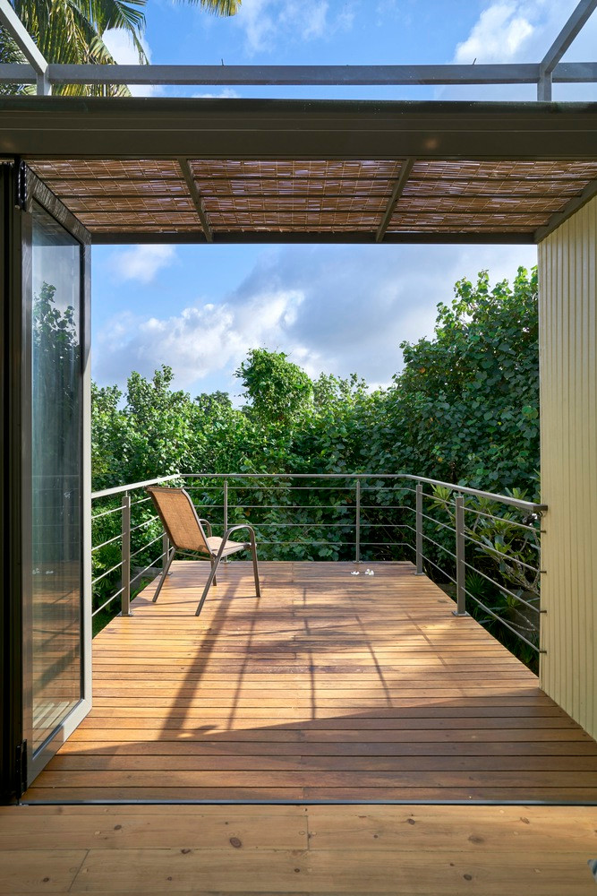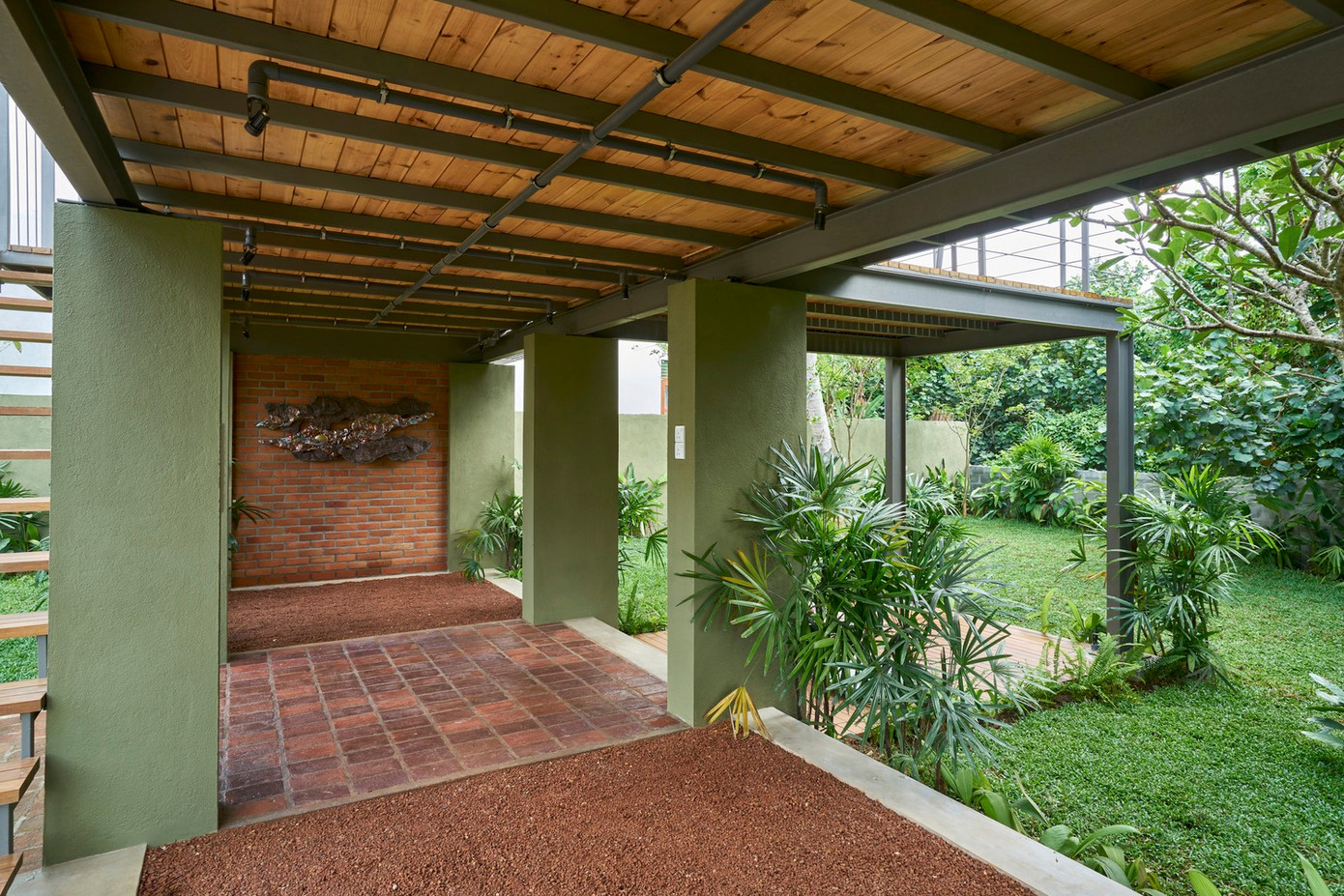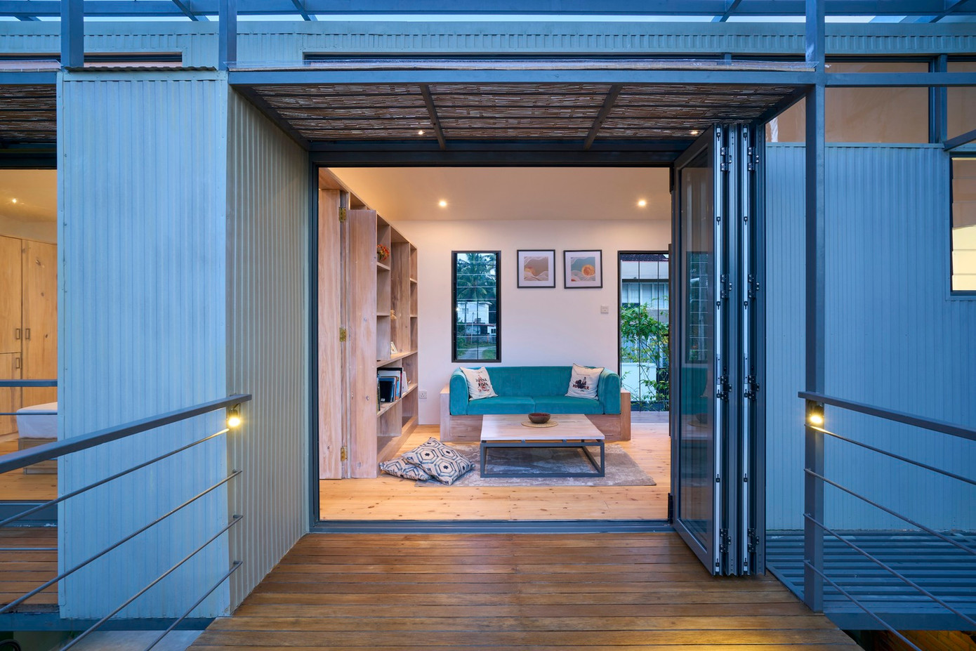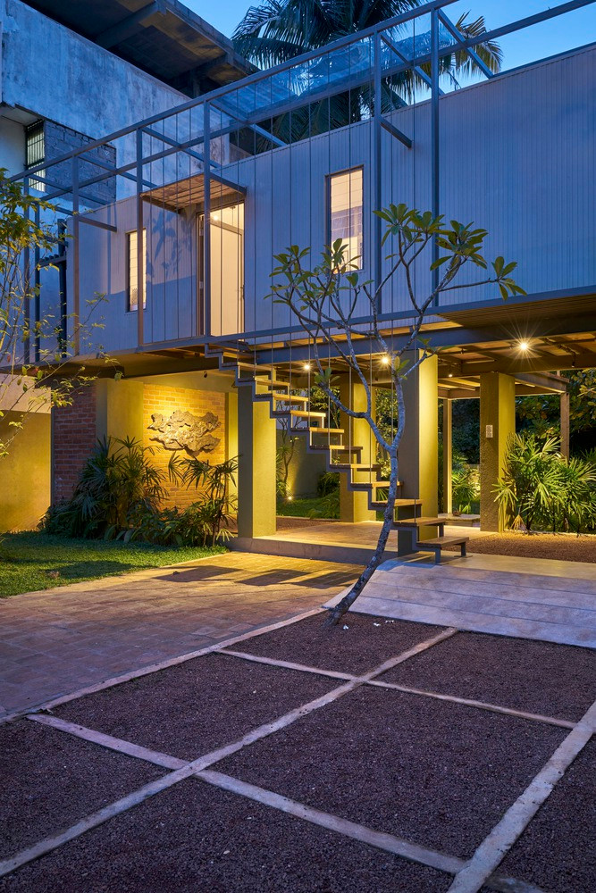 Ngôi nhà có kết cấu đặc biệt với tầng một chỉ có các trụ cọc, không tường bao, hoàn toàn thông mở với khu vườn, tầng hai là các phòng chức năng được xây dựng đơn giản từ khung thép và tấm vật liệu nhân tạo.