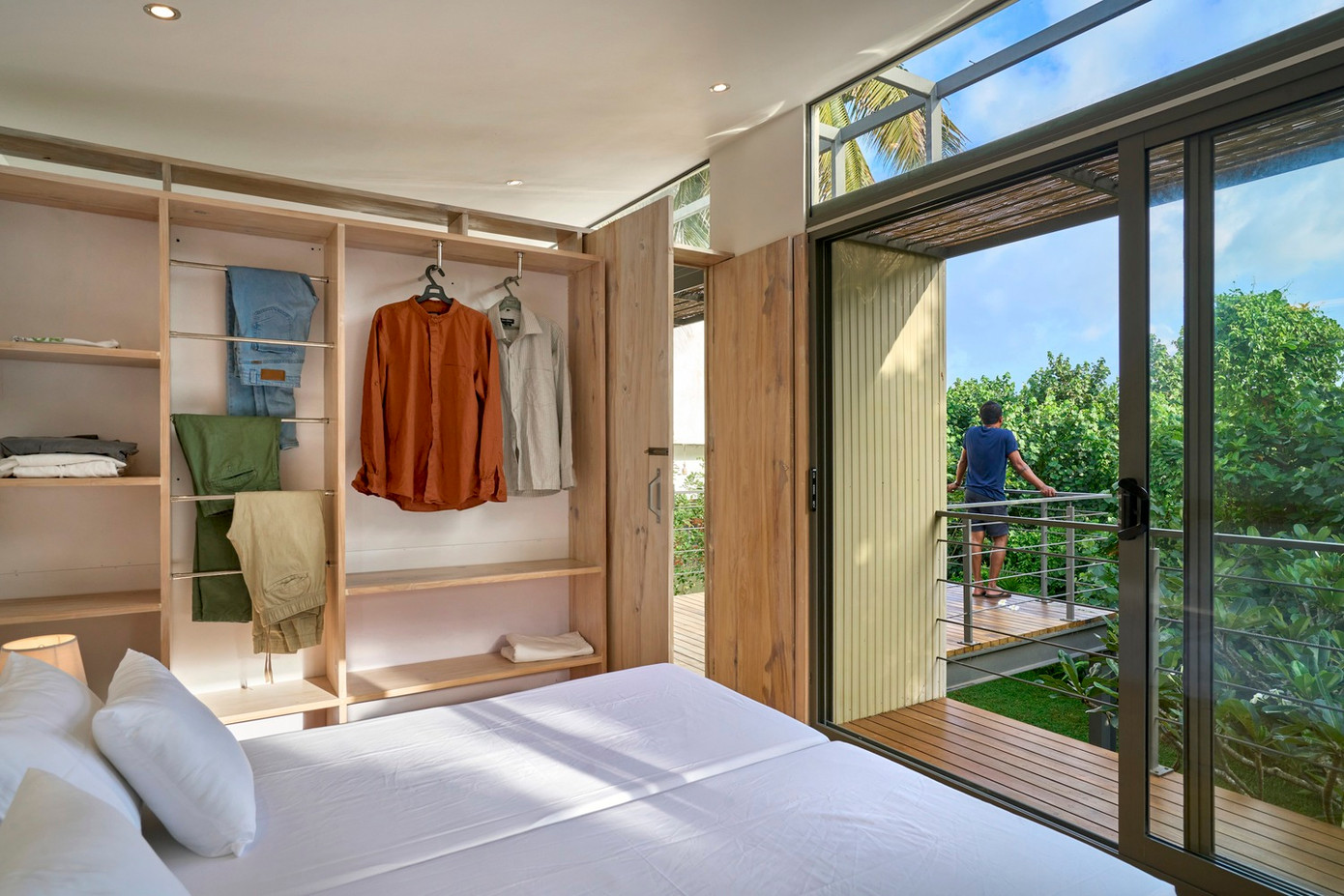 Ngôi nhà hình chữ T có phần ban công rộng đưa ra phía vườn, tạo sự chuyển tiếp mượt mà giữa khối kiến trúc và khối cảnh quan.