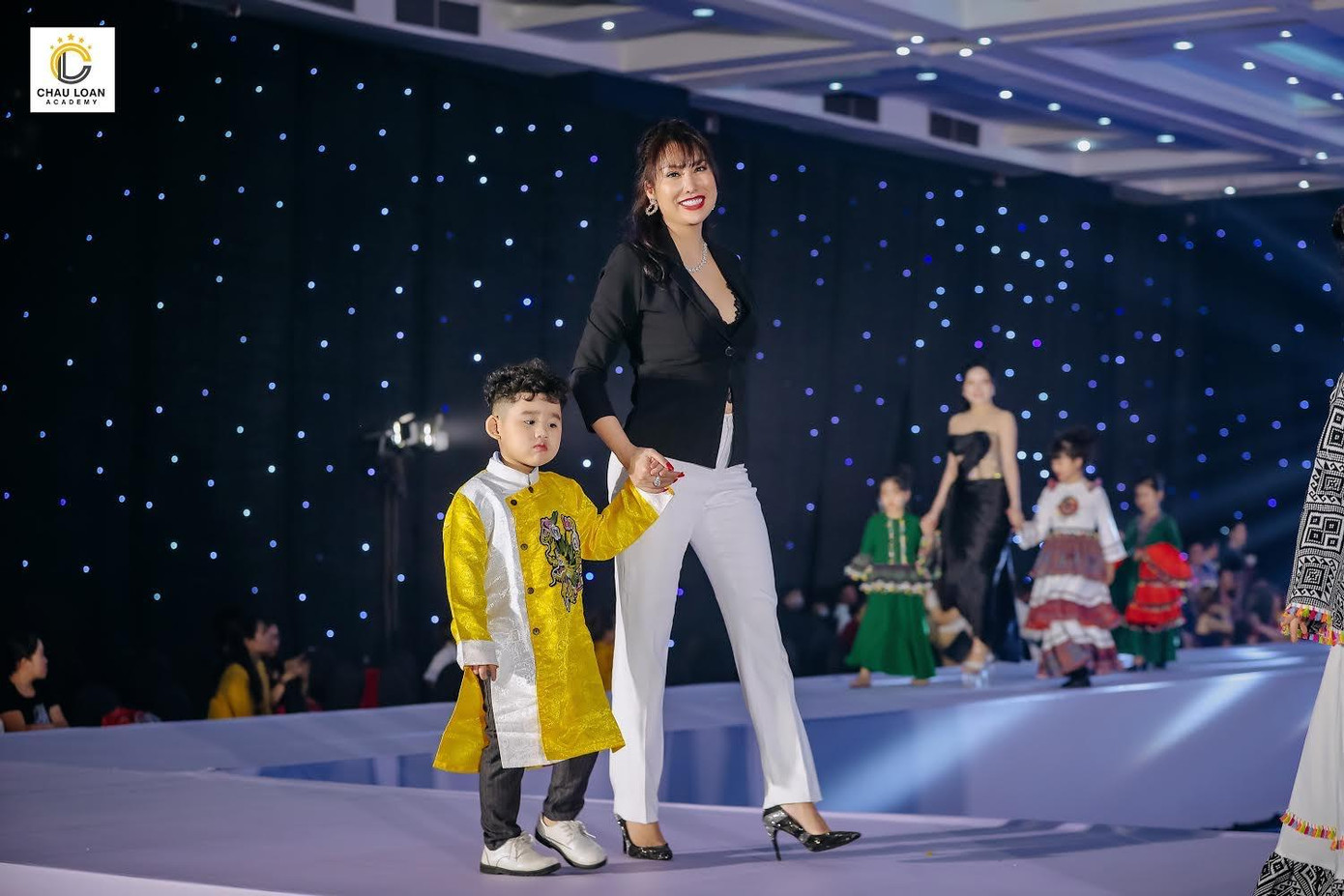 Tiếp đến là bộ sưu tập Hoàng Tử công chúa của Nhà thiết kế Châu Loan, lấy ý tưởng từ những câu chuyện cổ tích, NTK đã đặt hết tâm huyết vào trong BST “đo ni đóng giày” những bộ trang phục lộng lẫy dành cho những nàng công chúa xinh đẹp kiêu sa và chàng hoàng tử nam tính. BST có sự góp mặt của Doanh Nhân Thành Đạt Thu Dung làm Vedette.