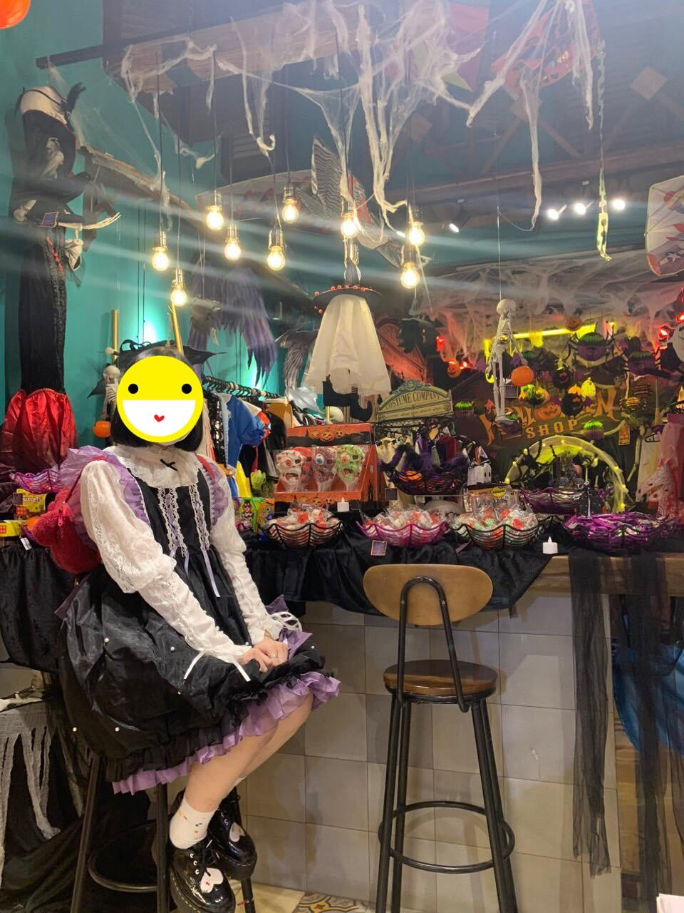 Không gian cửa hàng được trang trí mô phỏng theo những tiệm kẹo trong các thước phim kinh dị như tượng chú hề ma quái, bí ngô, bộ xương giả, mấy chú ma treo lơ lửng trên trần nhà.