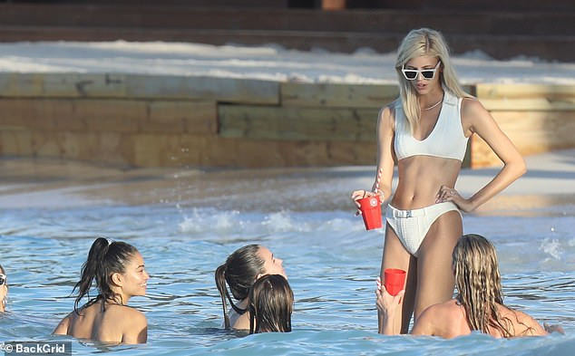 Cô dâu mới Devon Windsor diện bikini cắt cúp táo bạo khoe thân hình hoàn hảo như tượng tạc ở bể bơi khách sạn.