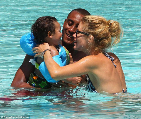Siêu mẫu cùng chồng Sunnery đã mang cậu con trai 18 tháng tuổi Phyllon để dậy cho cậu bé những bài học đầu tiên dưới nước. Cánh săn ảnh đã đeo bám rất sát gia đình siêu mẫu và chụp được những khoảnh khắc hạnh phúc của họ dưới hồ bơi.